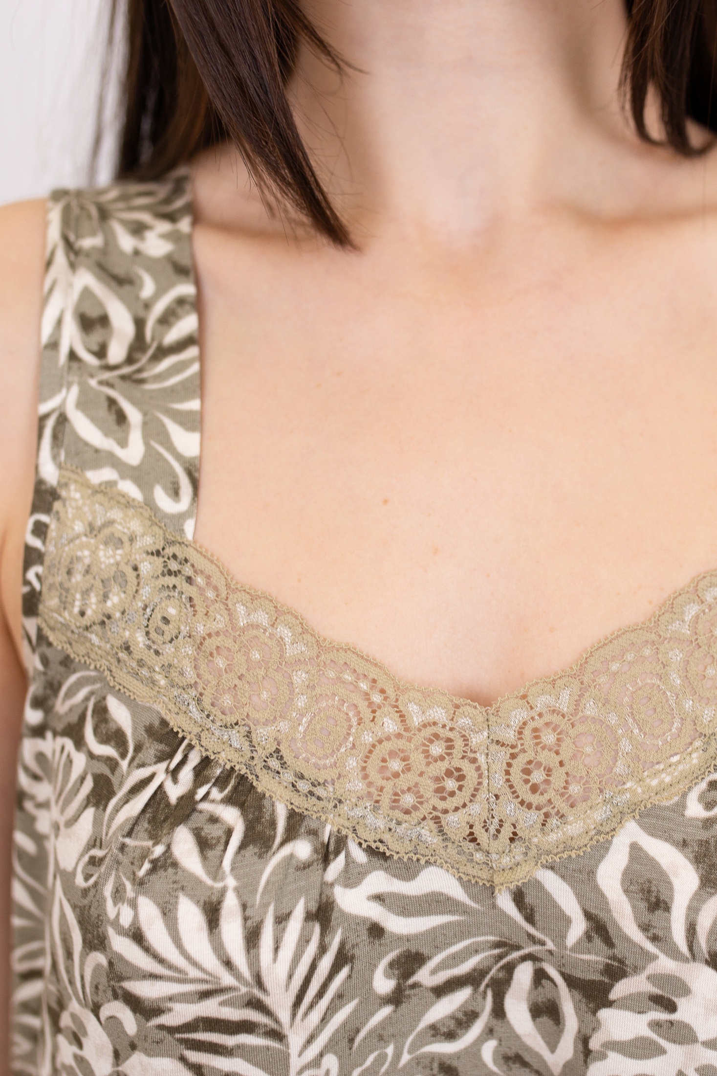 Элегантная ночная сорочка выполнена в нежных пастельных тонах с изысканным цветочным принтом в оттенках бежевого и серого. Модель средней длины с удобными тонкими бретелями и изящным кружевным декором по линии декольте добавляет изделию особый шарм. Ткань мягкая и приятная на ощупь, обеспечивает комфорт во время сна. Отличный выбор для тех, кто предпочитает сочетание стиля и комфорта в домашней одежде.