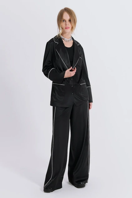Костюм- двойка в бельевом стиле из атласной ткани и контрастной отделкой. Детали: блуза полуприлегающего силуэта, спущенная линия плеча, нагрудные вытачки, пиджачный воротник, застежка на петли и пуговицы, накладные карманы, рукава длинные с притачными манжетами, съемный пояс. Брюки с высокой посадкой, смещенными боковыми швами, пояс притачной частично на резинке, по переду имитация застежки, карманы в швах