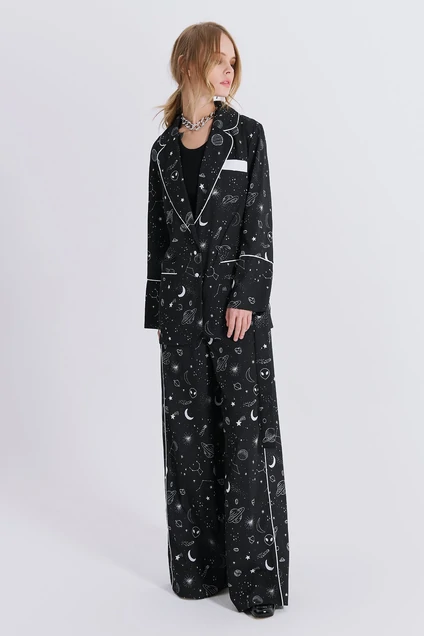 Костюм- двойка в бельевом стиле из атласной ткани и контрастной отделкой. Детали: блуза полуприлегающего силуэта, спущенная линия плеча, нагрудные вытачки, пиджачный воротник, застежка на петли и пуговицы, накладные карманы, рукава длинные с притачными манжетами, съемный пояс. Брюки с высокой посадкой, смещенными боковыми швами, пояс притачной частично на резинке, по переду имитация застежки, карманы в швах