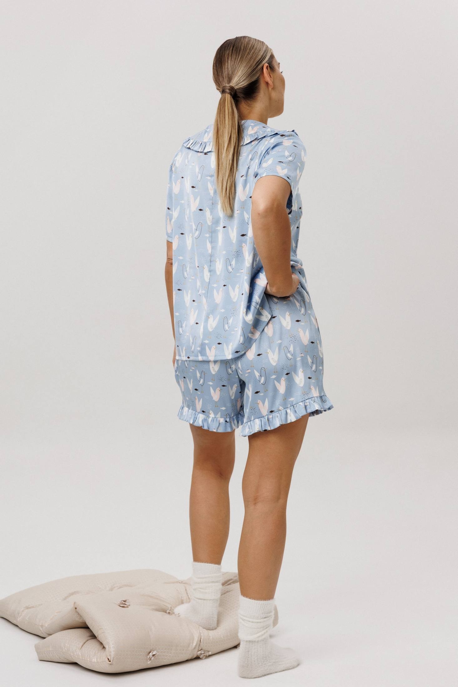 Воротник блузы и отделка шорт рюшами создают атмосферу сказочности и воздушности.