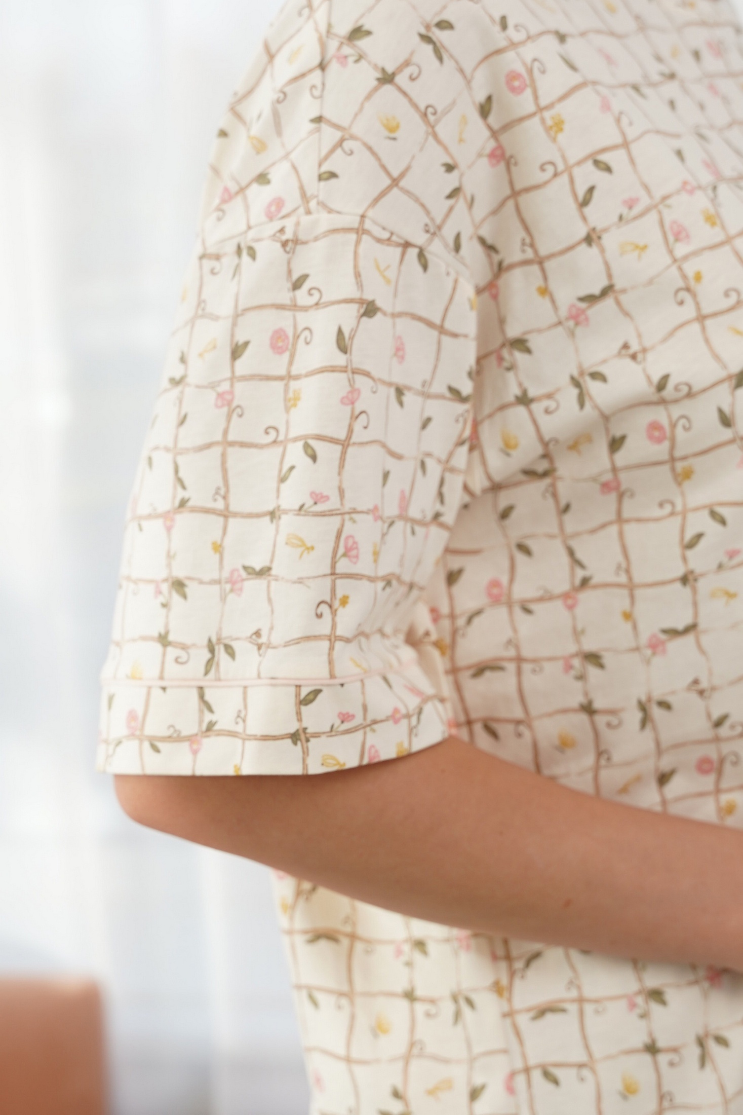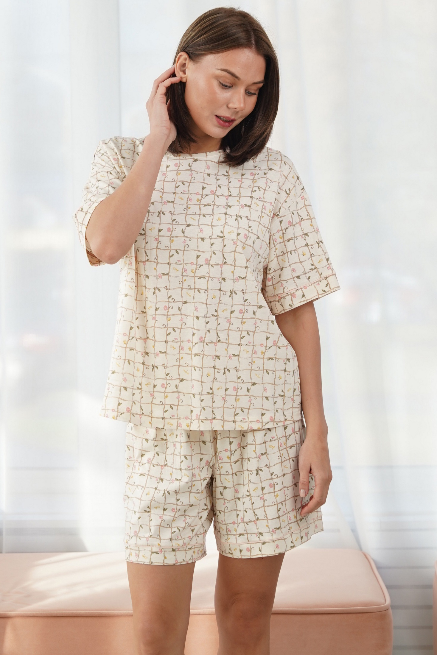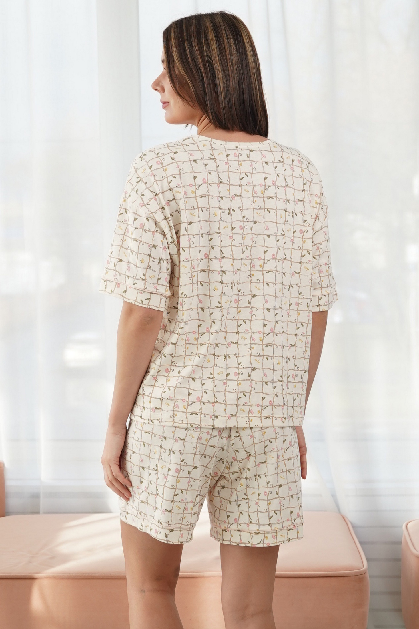 Элегантная женская пижама, выполненная в нежной цветовой палитре, идеально подойдет для создания комфортного домашнего образа. Комплект включает в себя короткие пижамные шорты и рубашку с короткими рукавами. Материал украшен изящным принтом в виде цветочных мотивов и геометрических фигур, создающих стильный и одновременно ненавязчивый вид. Рубашка с круглым вырезом горловины и ненавязчивым краем вдоль шеи добавляет элегантности образу. Этот комплект идеален для тех, кто ценит комфорт и стиль в домашней одежде.