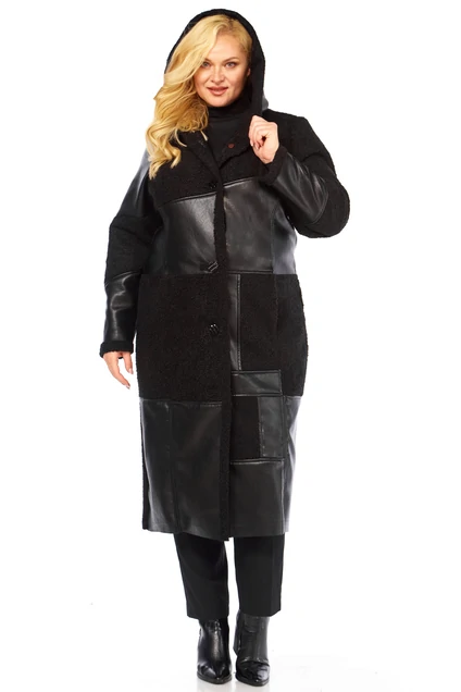 Верхняя часть выполнена из текстурированной меховой ткани, создающей уютный и объемный эффект. Нижняя часть и детали отделки выполнены из гладкой, сияющей экокожи, добавляющей образу динамики и современности.