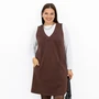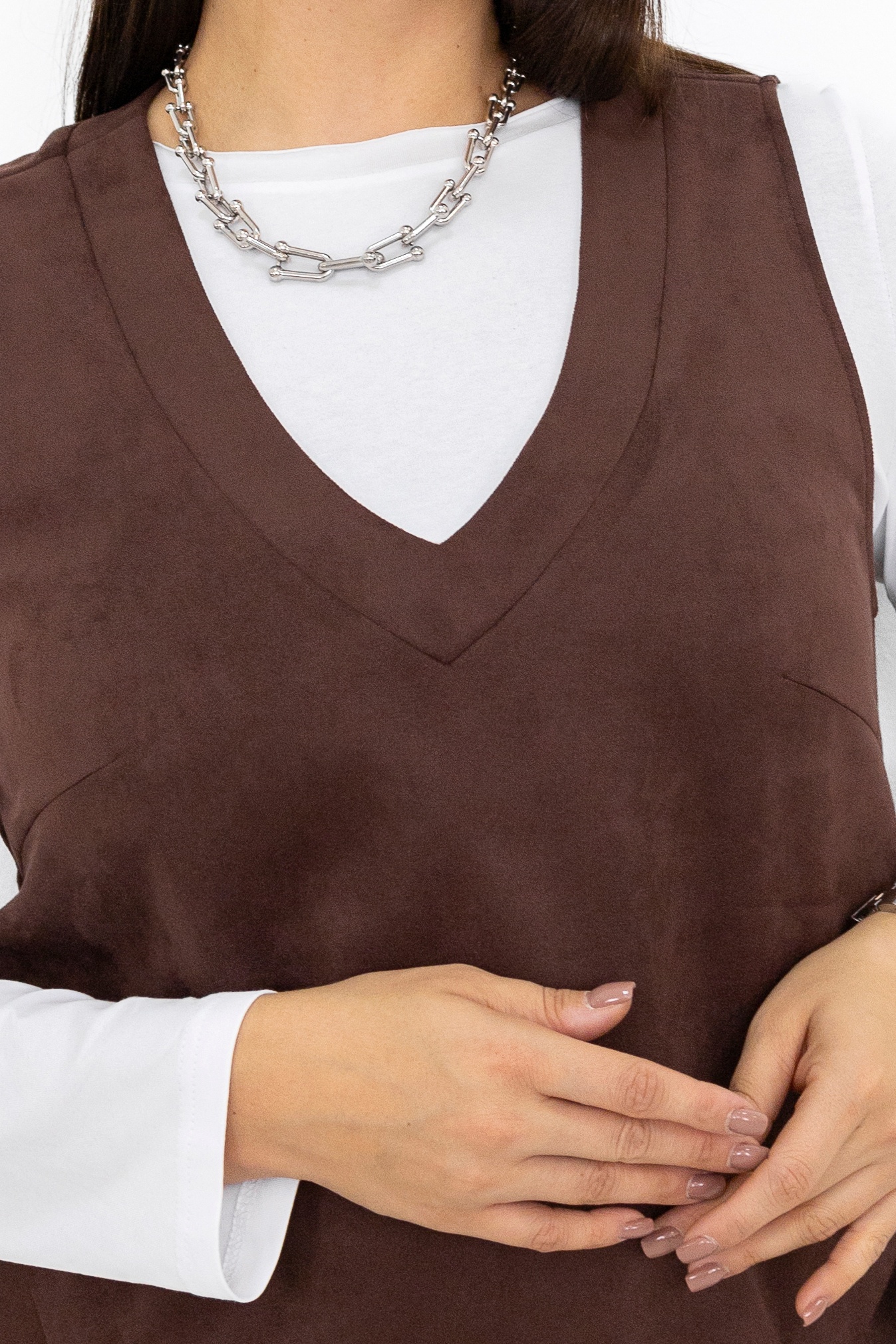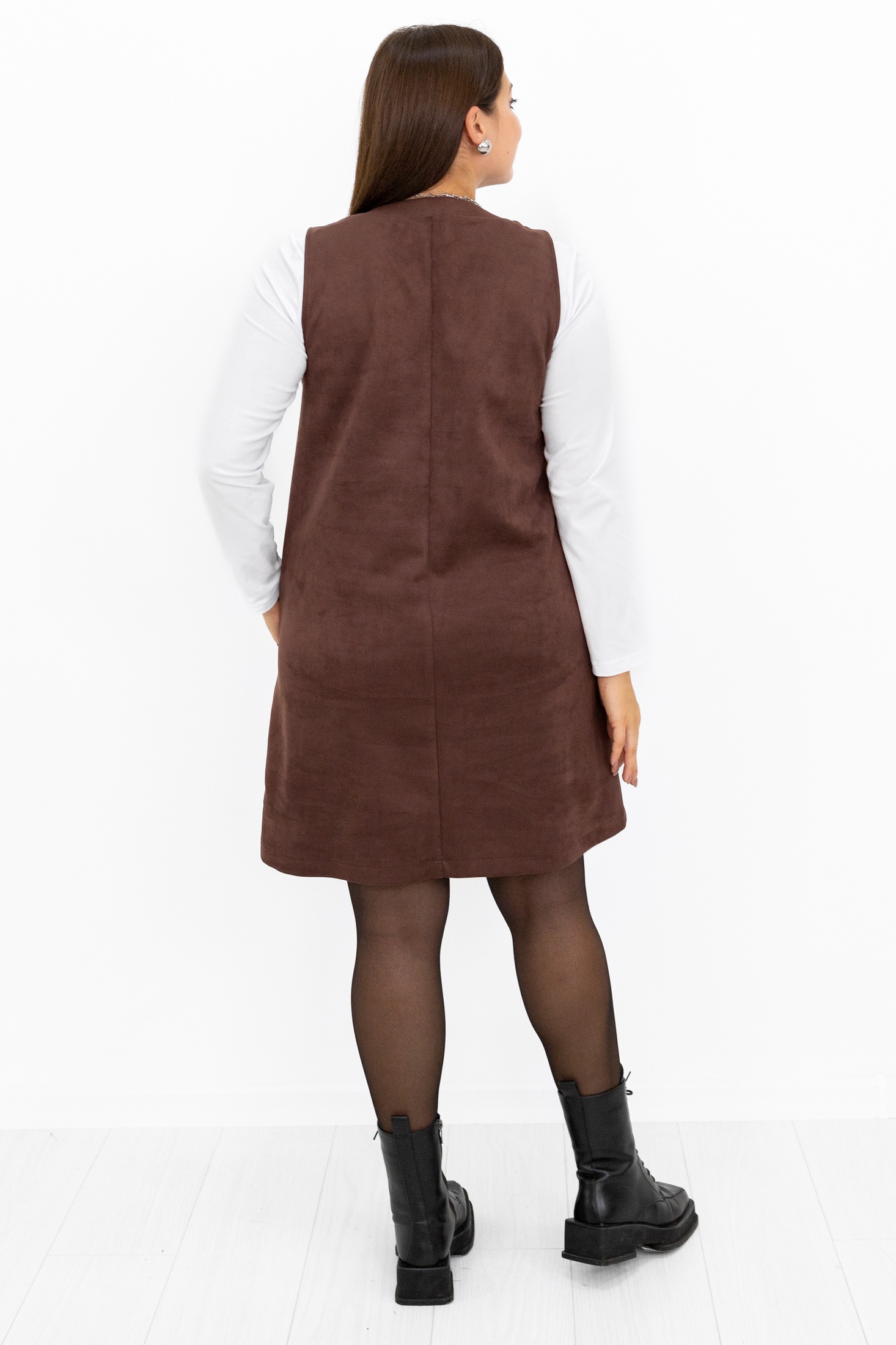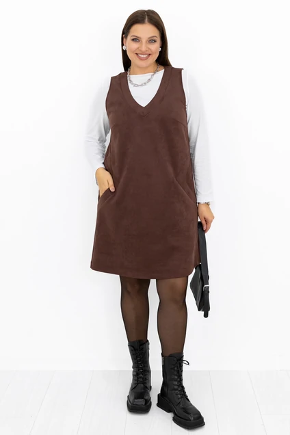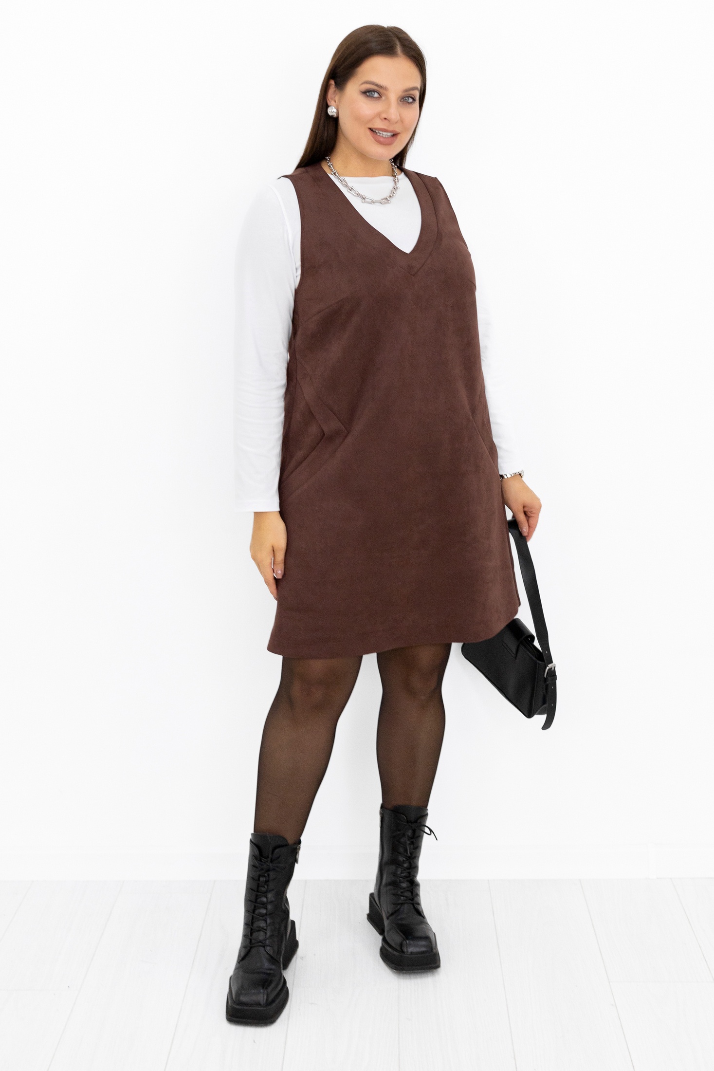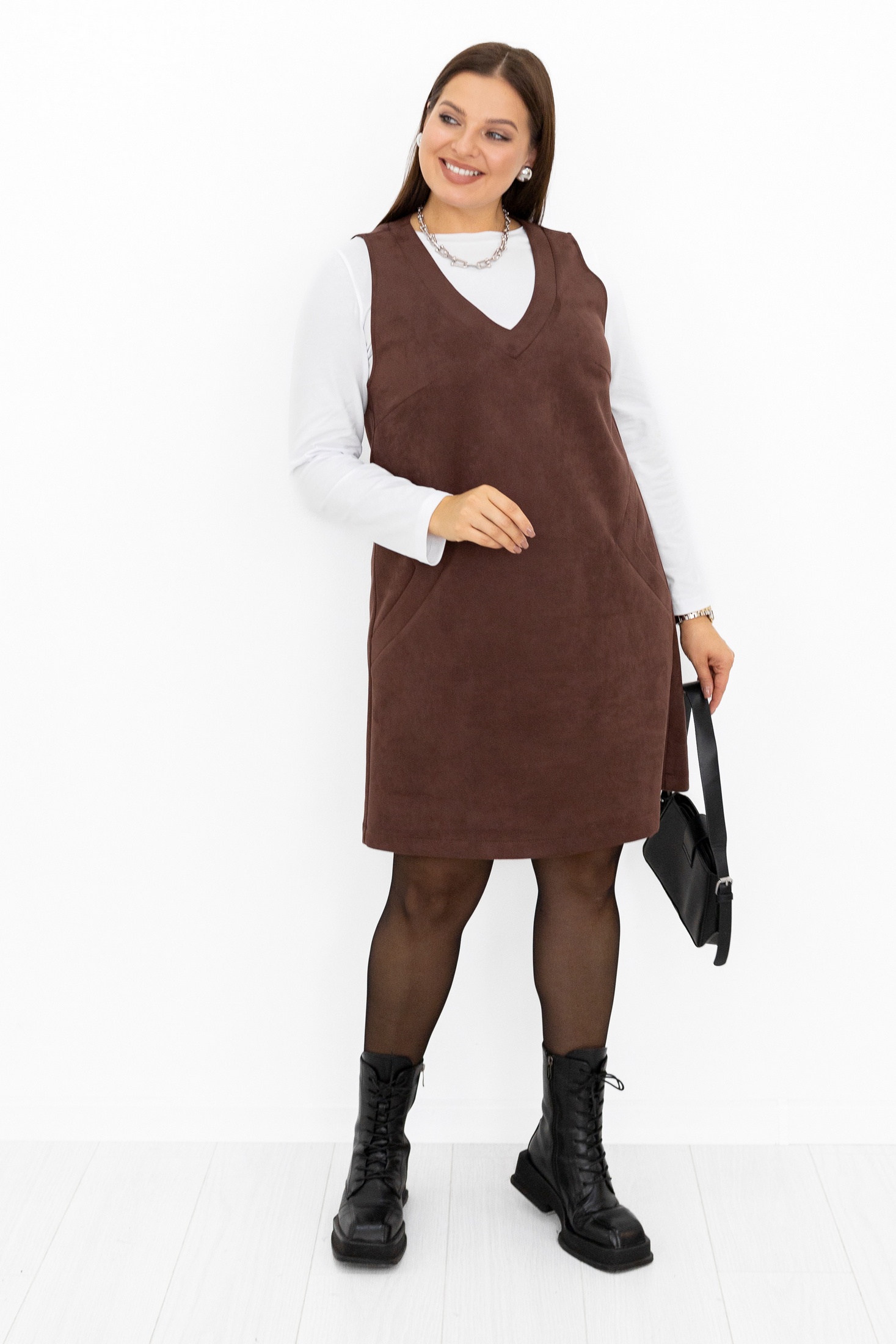Сарафан женский, длиной мини. Силуэт трапеция. Модель выполнена из фактурного трикотажа «замша». Вырез углубленный, V-образный с фигурной бейкой в тон. Пройма слегка углублена, для комфортной посадки по фигуре и обработана окантовкой. Карманы из боковых швов, с фигурным входом. Край кармана обработан притачной фигурной бейкой в тон изделия. Спинка со средним швом. Низ сарафана оформлен на распошивальной машине. Швы и строчки выполнены в тон изделия. Базовая модель, за счёт кроя, визуально стройнит и скрывает незначительные нюансы фигуры.