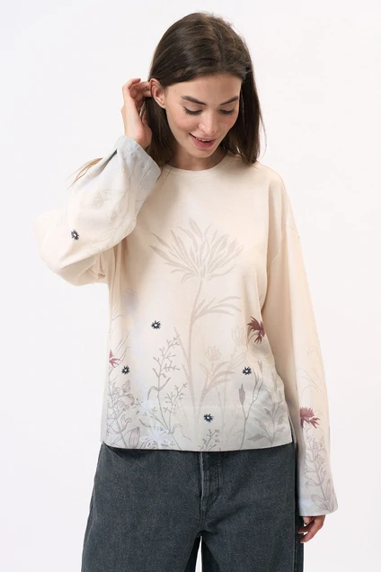 Джемпер женский свободного силуэта изготовлен из мягкого трикотажного полотна. Особенностью дизайна является круглая горловина и длинные рукава реглан с комбинированным кроем. Оформлен нежным пастельным тоном с элегантным цветочным принтом в нижней части. Принт выполнен в спокойных оттенках, добавляя шарма и утонченности изделию. Обратите внимание на возможное отличие по оттенку на фотографии из-за разной цветопередачи монитора. Этот джемпер будет стильным дополнением к повседневному гардеробу.