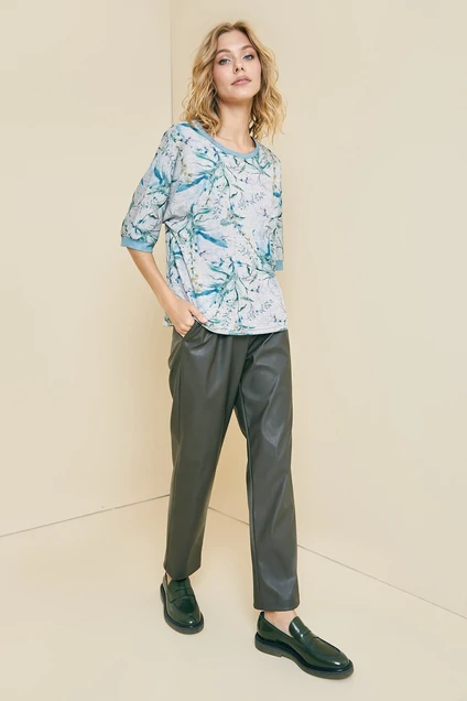 Джемпер прямого силуэта, с цельнокроеным рукавом длиной 3/4 и манжетой.