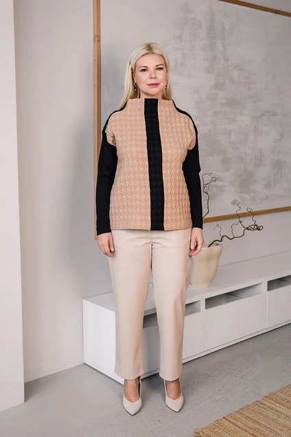 Свитшот комбинированный за-уженного силуэта с длинным рука-вом. Горловина с цельнокроеной стойкой.