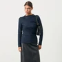 Элегантный трикотажный джемпер темно-синего цвета. Модель с длинными рукавами и необычной горловиной-лодочкой добавляет изысканности образу. Дизайн джемпера украшен оригинальными складками по передней части, которые придают ему особый акцент и женственность. Этот джемпер идеально подходит для создания как повседневного, так и делового ансамбля.