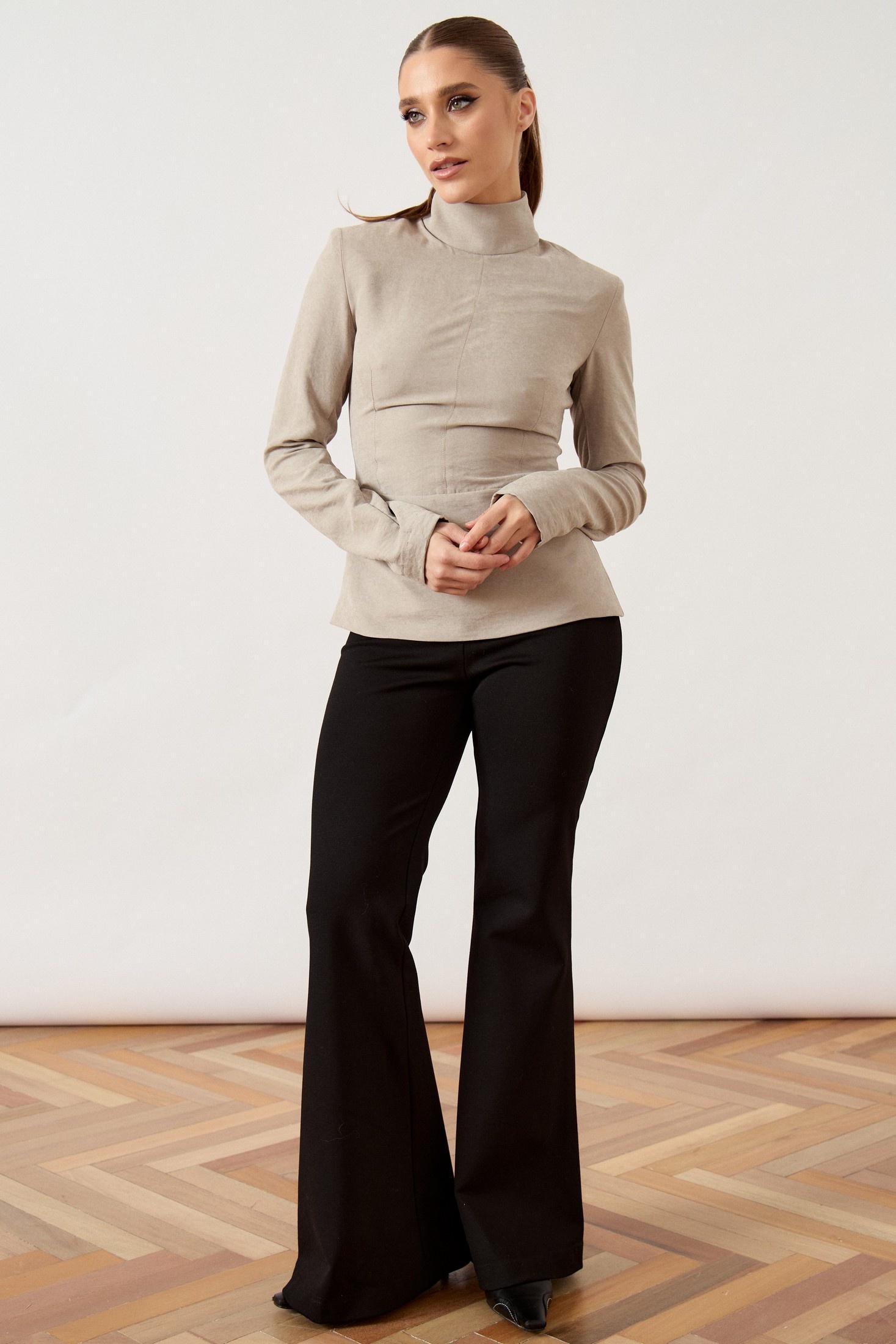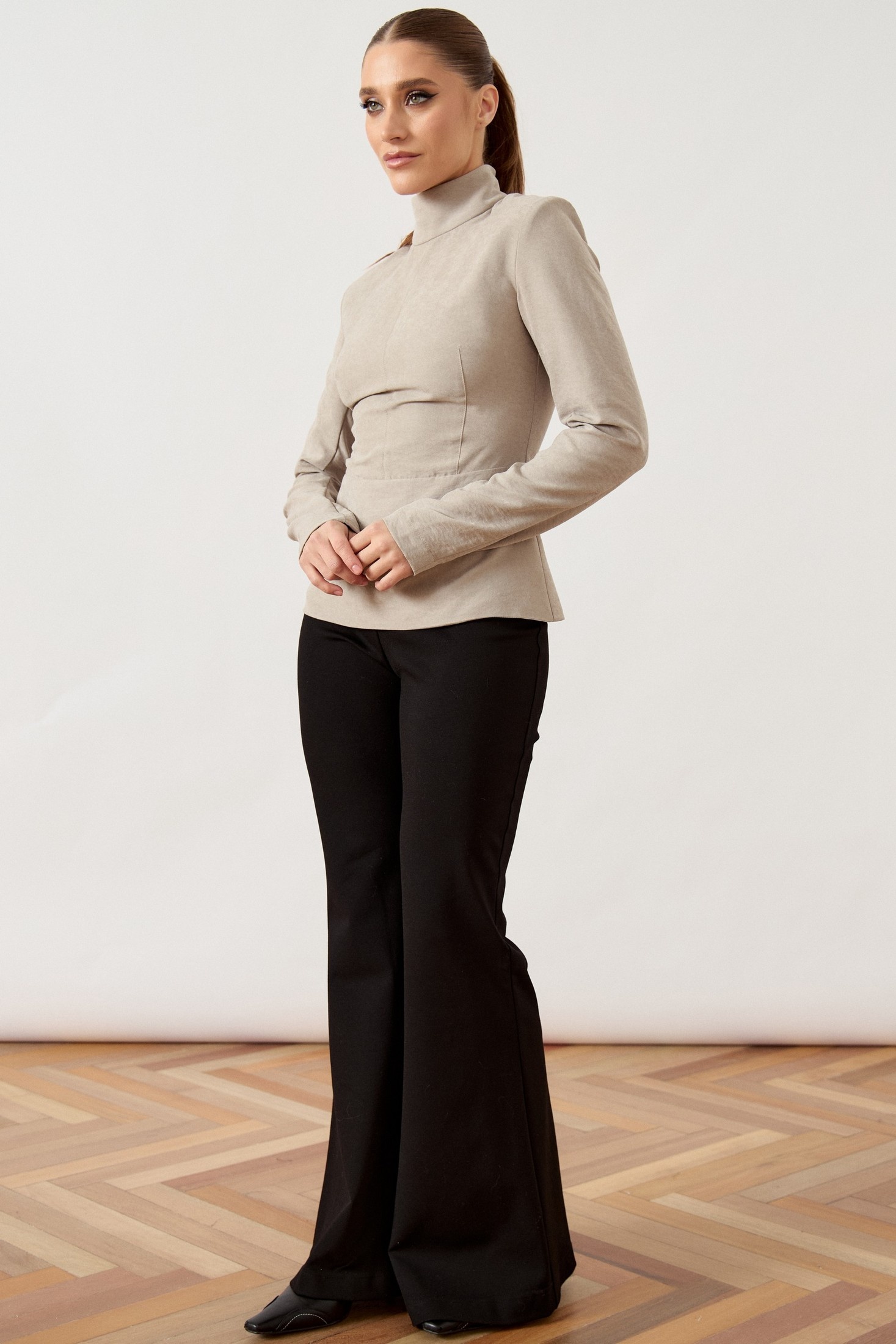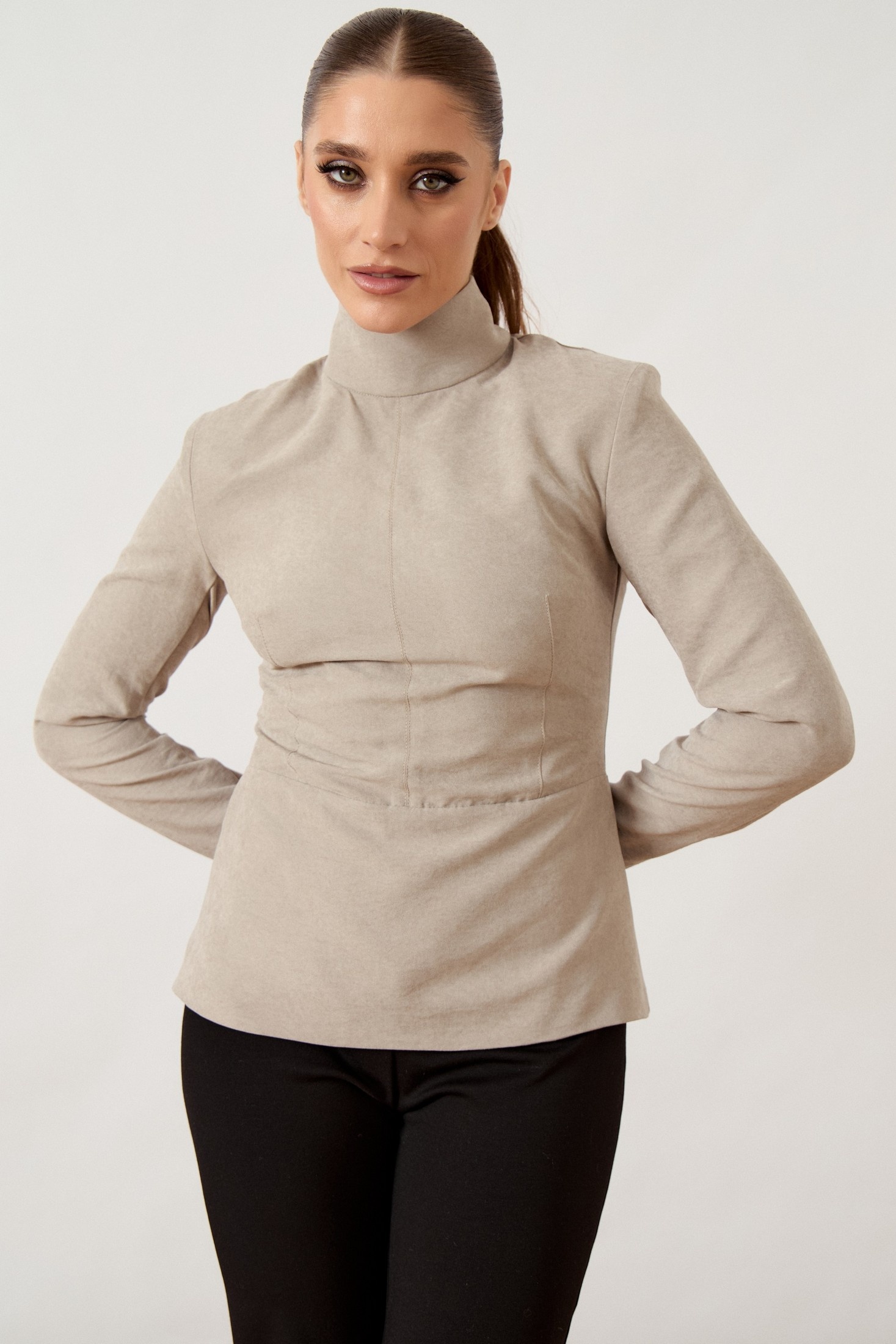 Джемпер прилегающего силуэта выполнена из мягкой костюмно-плательной ткани бежево-песочного оттенка. Модель с воротником-стойкой и длинными втачными рукавами. Передняя часть блузы со сложным конструктивным кроем: горизонтальный подрез по линии талии дополнен вертикальными и нагрудными вытачками, обеспечивающими идеальную посадку по фигуре. Спинка с центральным швом и потайной застежкой-молнией