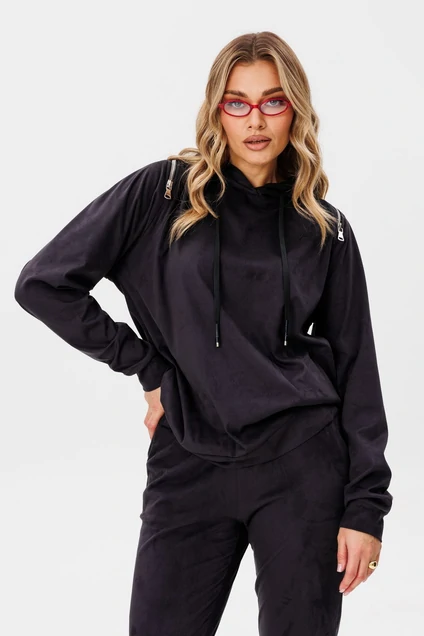 Худи из мягкой искуственной замши, свободного кроя с капюшоном. Низ изделия и рукавов- притачной манжет. Боковые карманы в швах. Рукав- реглан. В шов втачивания рукава спереди, по верхней части спинки вставлена металлическая молния.