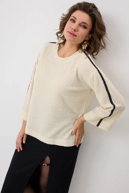 Нежный свитшот свободного кроя из фактурного трикотажа с вплетением мерцающих нитей в благородном оттенке топлёного молока - идеальный выбор для уютных и элегантных образов. Модель идеально впишется в Ваш гардероб, позволяя создавать множество современных сочетаний с жакетами, брюками, юбками и различной обувью.