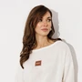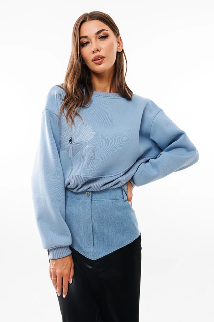 Джемпер прямого силуэта с втачным рукавом и спущенной линией плеча. По низу рукавов манжета из отделочной ткани. Джемперс вышивкой по переду. По переду и спинке фигурный подрез. Нижняя часть джемпера выполнена из отделочной ткани. По низу изделия и горловине планка из отделочной ткани.