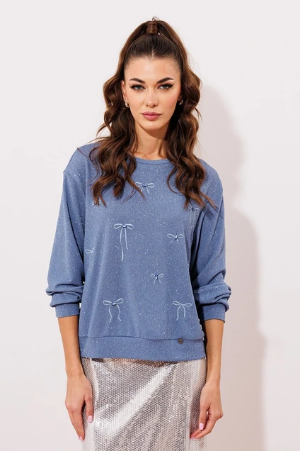 Джемпер прямого силуэта, с втачным одношовным рукавом, внизу на манжете. Плечевой пояс слегка спущен. По горловине и низу джемпера планки из основной ткани. На переднем полотнище вышивка Бантики с пришивными стразами в оправе. Трикотажное полотно из которого выполнен джемпер с приятным мерцанием. В этом джемпере вы точно будете неотразимы.