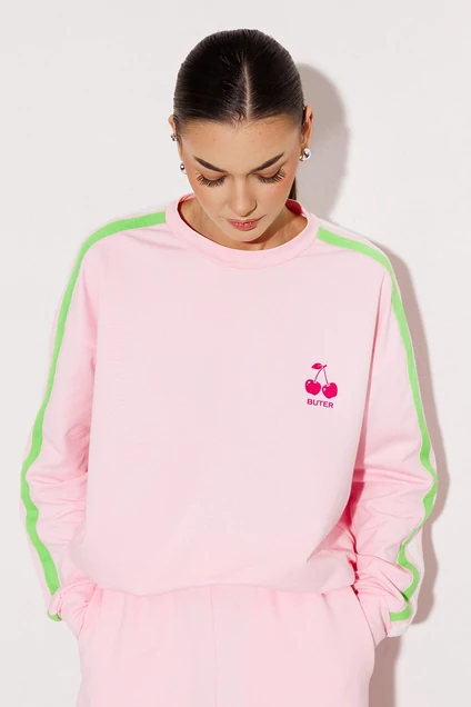 Джемпер трикотажный прямого силуэта с втачным рукавом и спущенной линией плеча, с манжетой по низу рукава. По плечу и рукаву вставка с 2-мя настроченными лампасами. Полочка с печатью "Cherry". По горловине притачная планка. В подгибку низа втянут шнурок благодаря чему изделие можно затянуть.