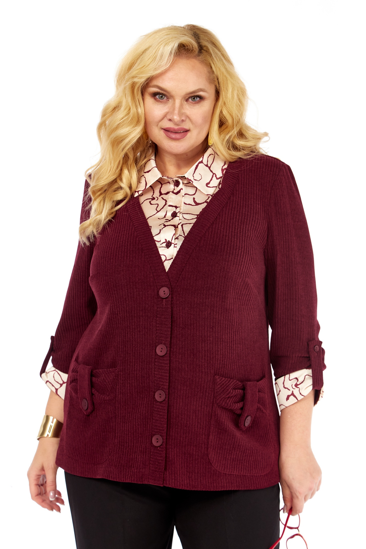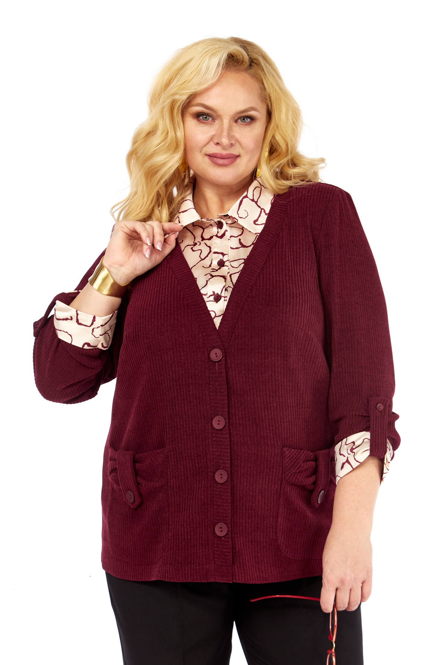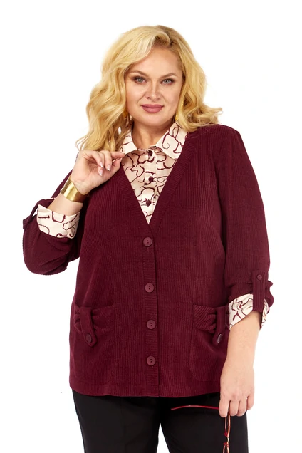 Имитация рубашки под джемпером - это отличный вариант практичной и удобной одежды. Джемпер прямого силуэта, комбинированный, выполнен из мягкого трикотажа и блузочной ткани. Полочка с нагрудными вытачками, накладными фигурными карманами, декорированной патой. Стояче-отложной воротник блузки хорошо смотрится с V-образным вырезом горловины. Рукав втачной, одношовный, с отложной манжетой из отделочной ткани. Пата на рукаве позволяет регулировать его длину.