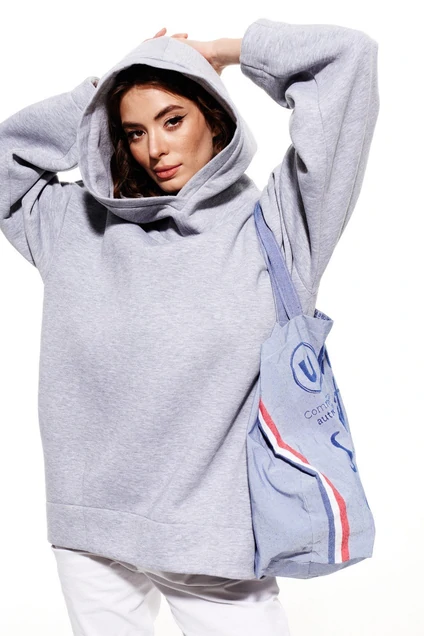 Джемпер женский, свободного силуэта, длиной ниже линии бедер из трикотажного полотна, со спущенной линией плеча. Рукав одношовный, втачной, длинный, с широкой обтачкой по низу. Низ джемпера фигурный с вытачками, обработан широкой обтачкой. Горловина обработана капюшоном с цельнокроеной стойкой. Капюшон на подкладке. Длина 78 см, рукав от горловины 72 см.