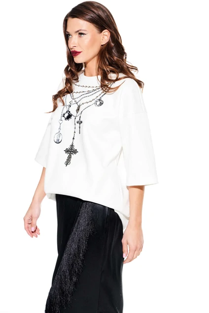 Элегантный белый джемпер из трикотажного полотна идеально дополнит ваш гардероб. Представленный в свободном объеме и прямом силуэте, этот универсальный джемпер оснащен круглым вырезом горловины. Спокойная передняя часть украшена стильным принтом в виде цепей, добавляющим изюминку в образ. Передняя часть и спина джемпера цельные, что подчеркивает его лаконичный дизайн. Идеальное решение для современного и трендового look'a.