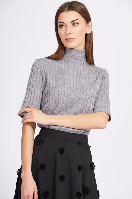 Джемпер выполнен из трикотажного полотна в рубчик. Джемпер полуприлегающего силуэта, длиной выше линии бедер. Перед и спинка цельные. Воротник-стойка. Рукав одношовный, длиной выше линии локтя.