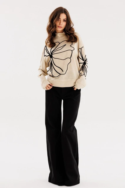 Джемпер выполнен из трикотажного полотна. Джемпер О-образного силуэта, длиной до линии бедер. Перед и спинка цельные. Горловина округлой формы с воротником-стойкой. Плечевой шов удлинен. Рукав рубашечного покроя, одношовный. Низ рукава на притачной манжете из основной ткани. Джемпер декорирован вышивкой по переду и левому рукаву.