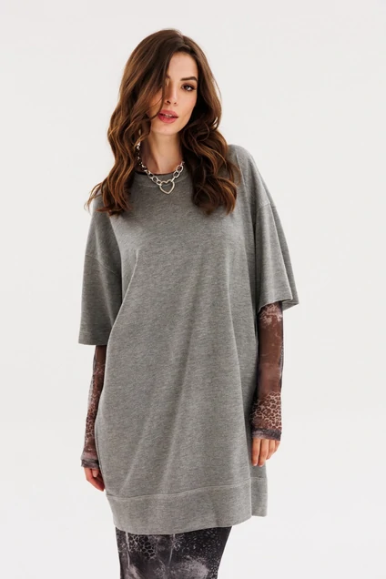 Джемпер выполнен из трикотажного полотна. Джемпер прямого силуэта, длиной выше линии бедер. Перед и спинка цельные. Горловина округлой формы, обработана бейкой из основной ткани. Плечевой шов удлинен. Рукав длиной до локтя. Низ джемпера на притачной манжете.