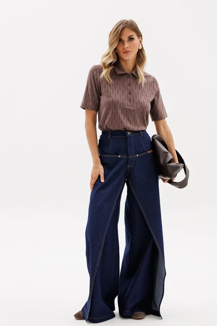 Джемпер выполнен из трикотажного полотна с рисунком. Джемпер полуприлегающего силуэта, длиной выше линии бедер. Спереди застежка на пуговицы. Воротник стояче-отложной. Плечевой шов удлинен. Рукав втачного покроя, одношовный, выше линии локтя.