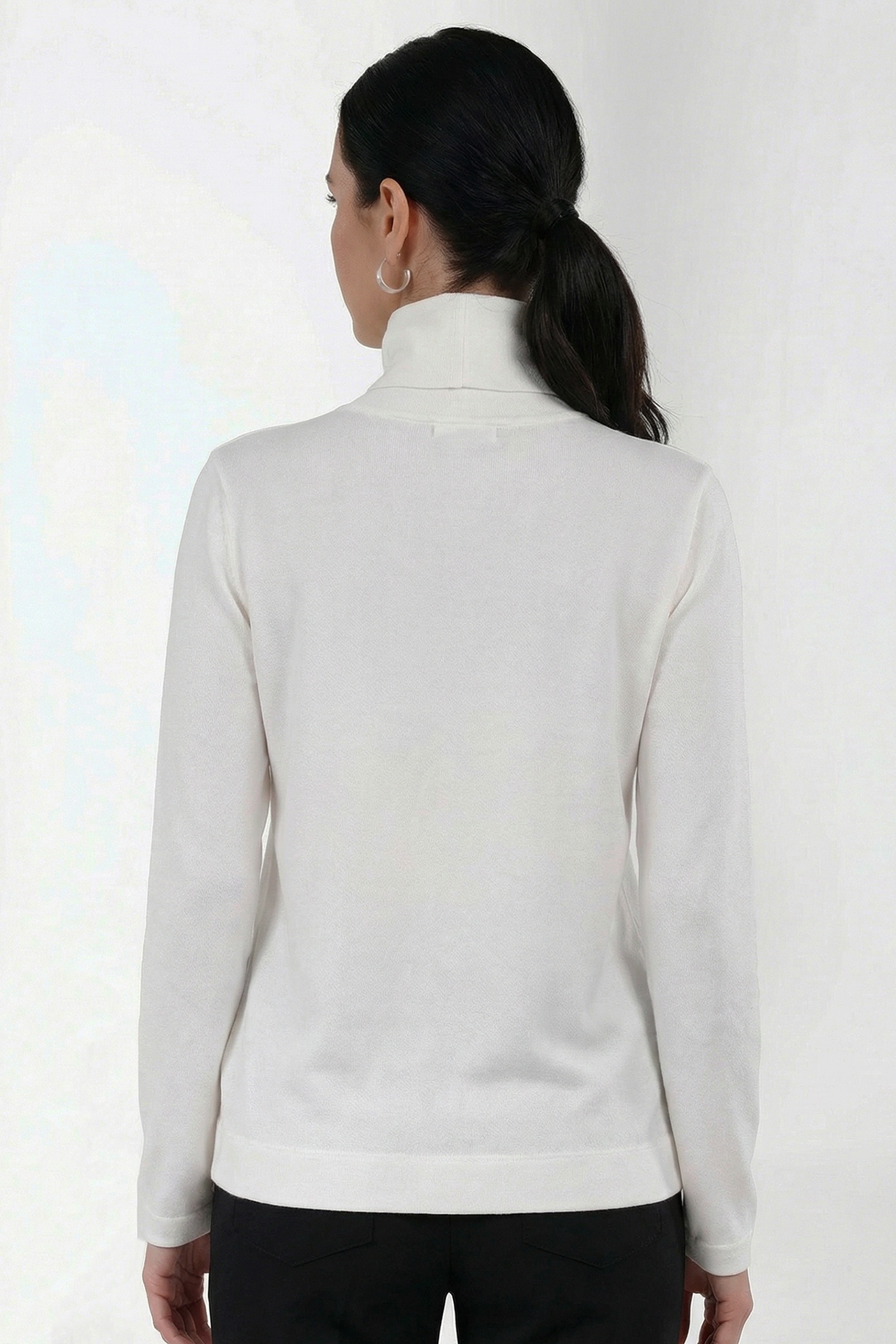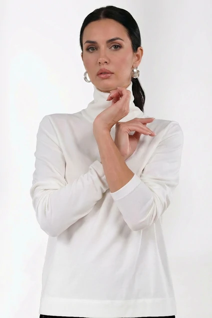 Элегантный белый джемпер на каждый день — идеальный базовый элемент гардероба. Изделие изготовлено из качественного трикотажа средней плотности, который не только приятен к телу, но и хорошо сохраняет тепло. Гольф с воротником-хомутом подчеркивает изысканность модели, делая ее универсальным выбором как для офиса, так и для повседневной носки. Джемпер выполнен без видимых узоров или принтов, что добавляет лаконичности его дизайну. Втачной рукав и полуприлегающий силуэт обеспечивают комфортное прилегание.
