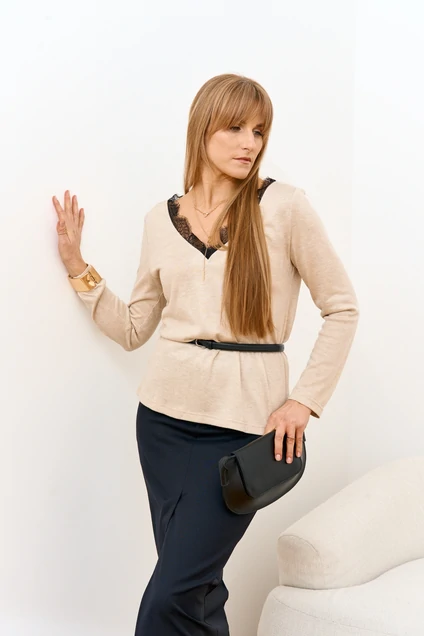 Лонгслив с V-образным вырезом спереди и сзаади, изящно обработан нежным гипюром черного цвета. Мягкий трикотаж, идеальная посадка и утонченная женственность в каждой детали. Длина изделия 64 см