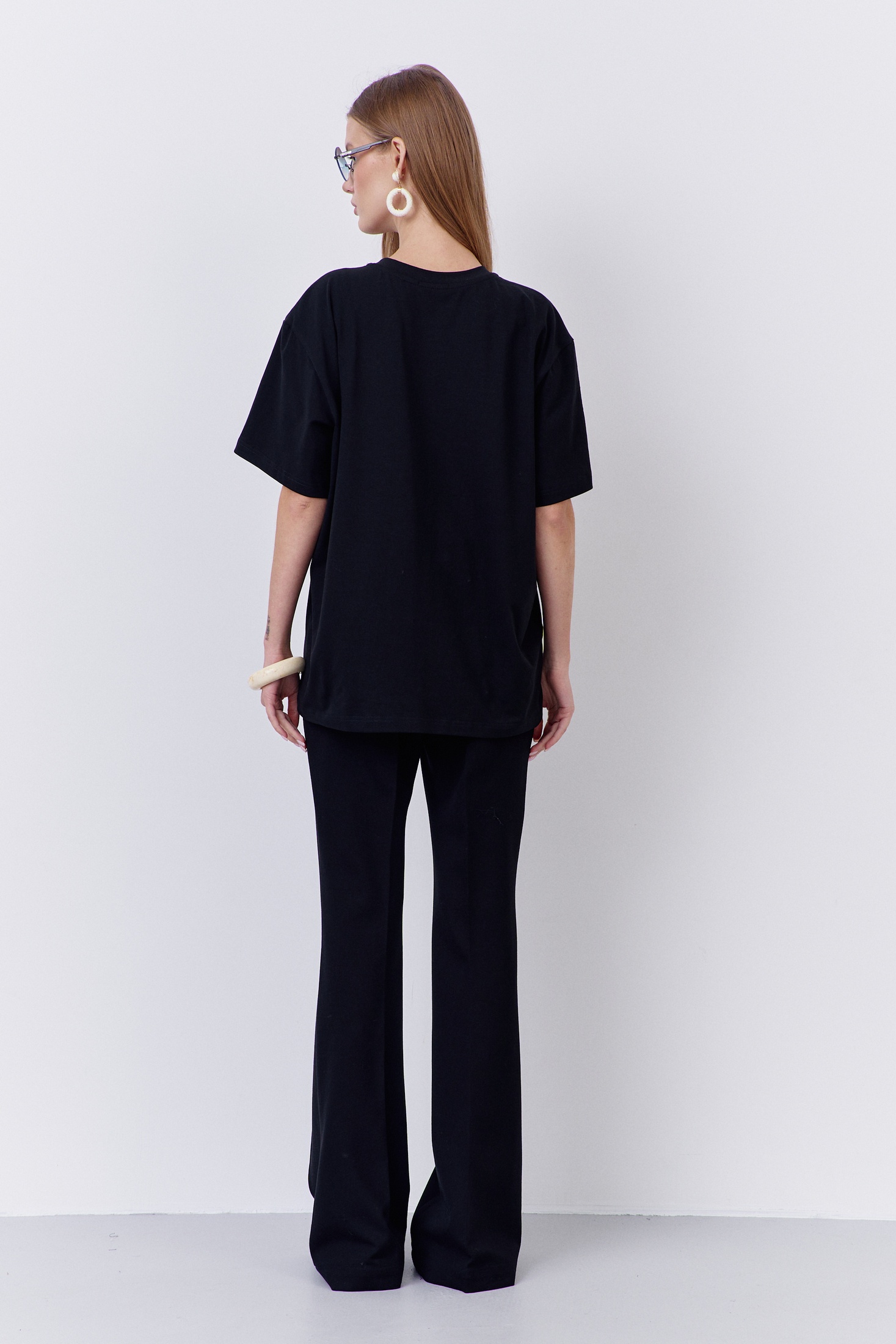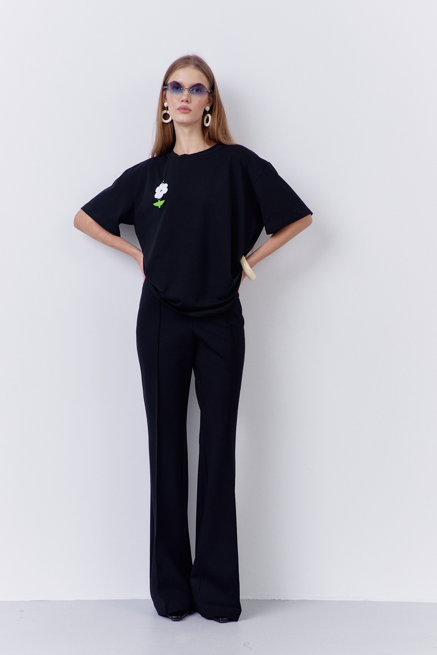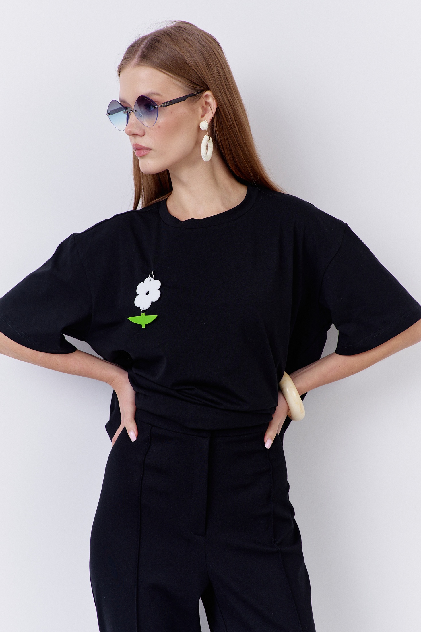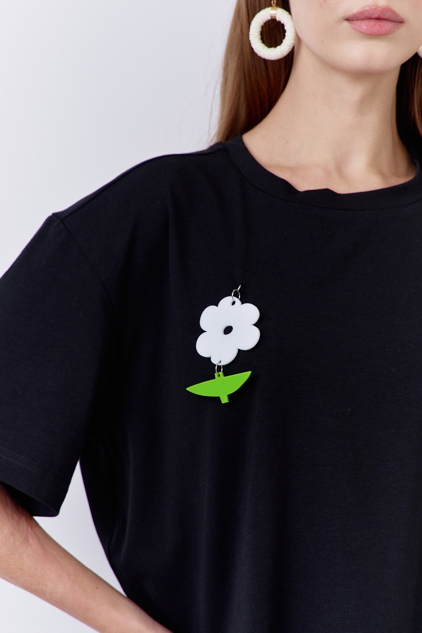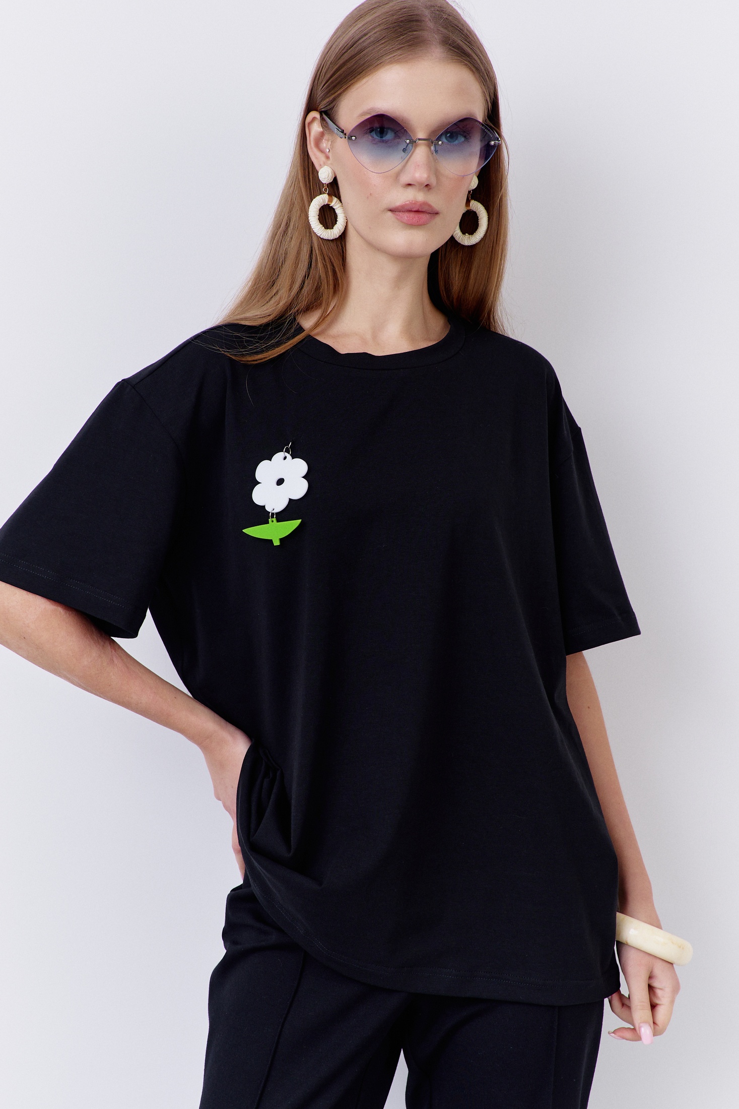 Джемпер свободного силуэта со спущенным рукавом. Характеристики: выполнена из трикотажного полотна в черном цвете с декоративным съемным цветком брошью, горловина обработана планкой, рукав укороченный.