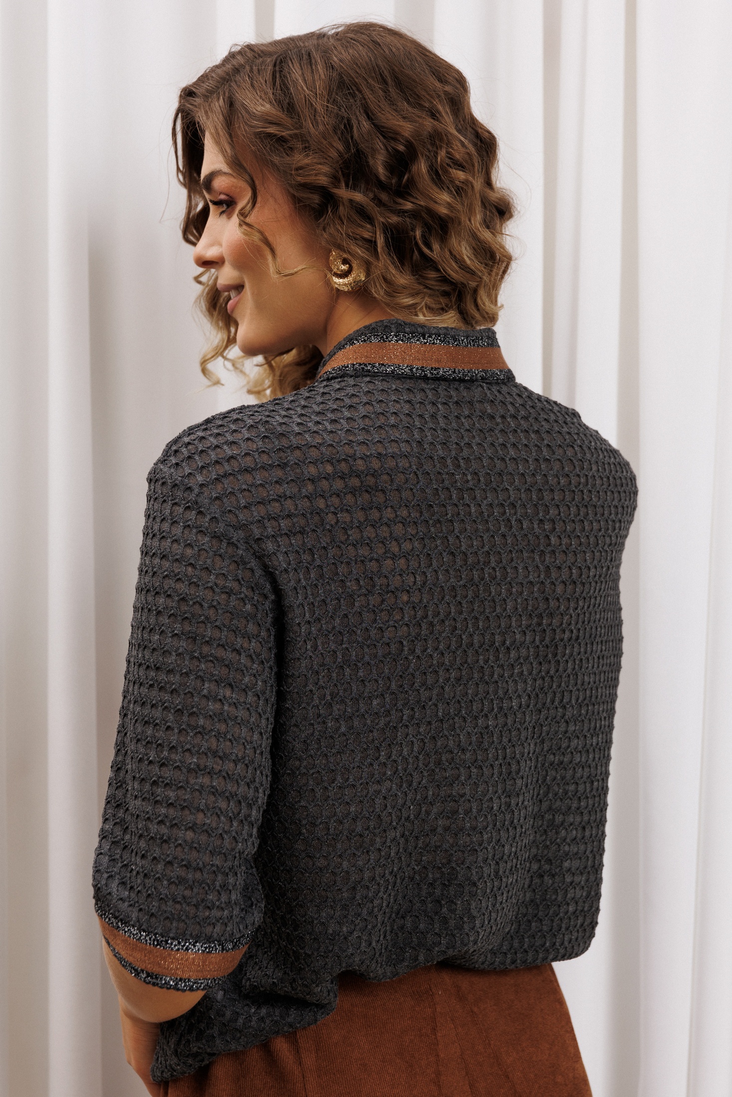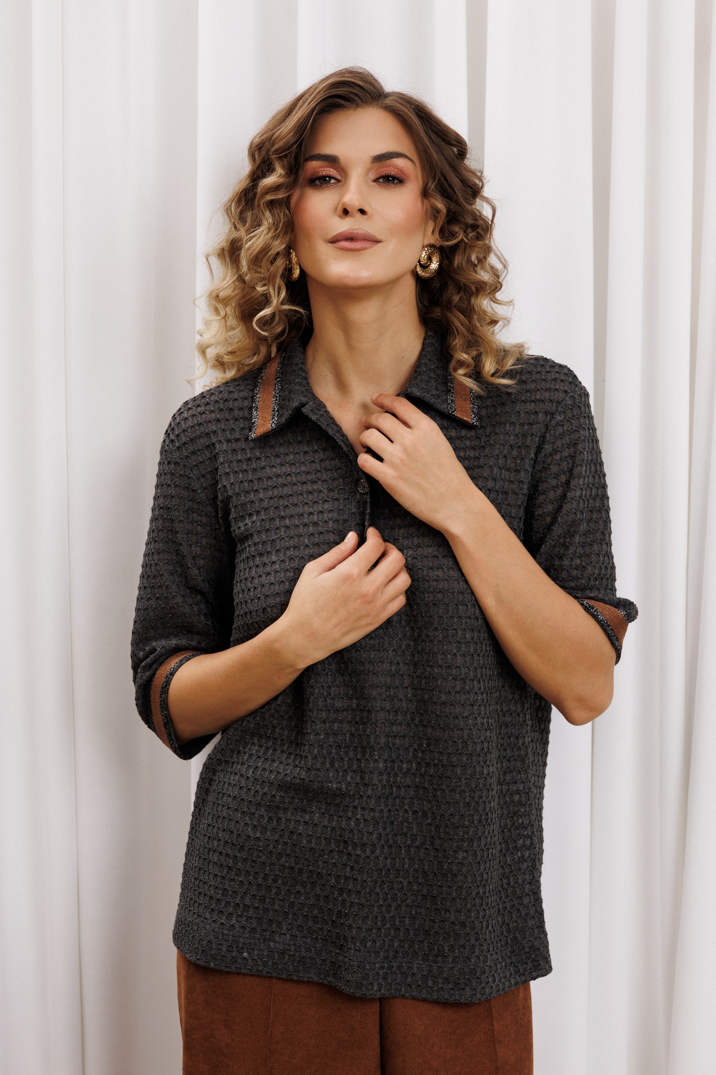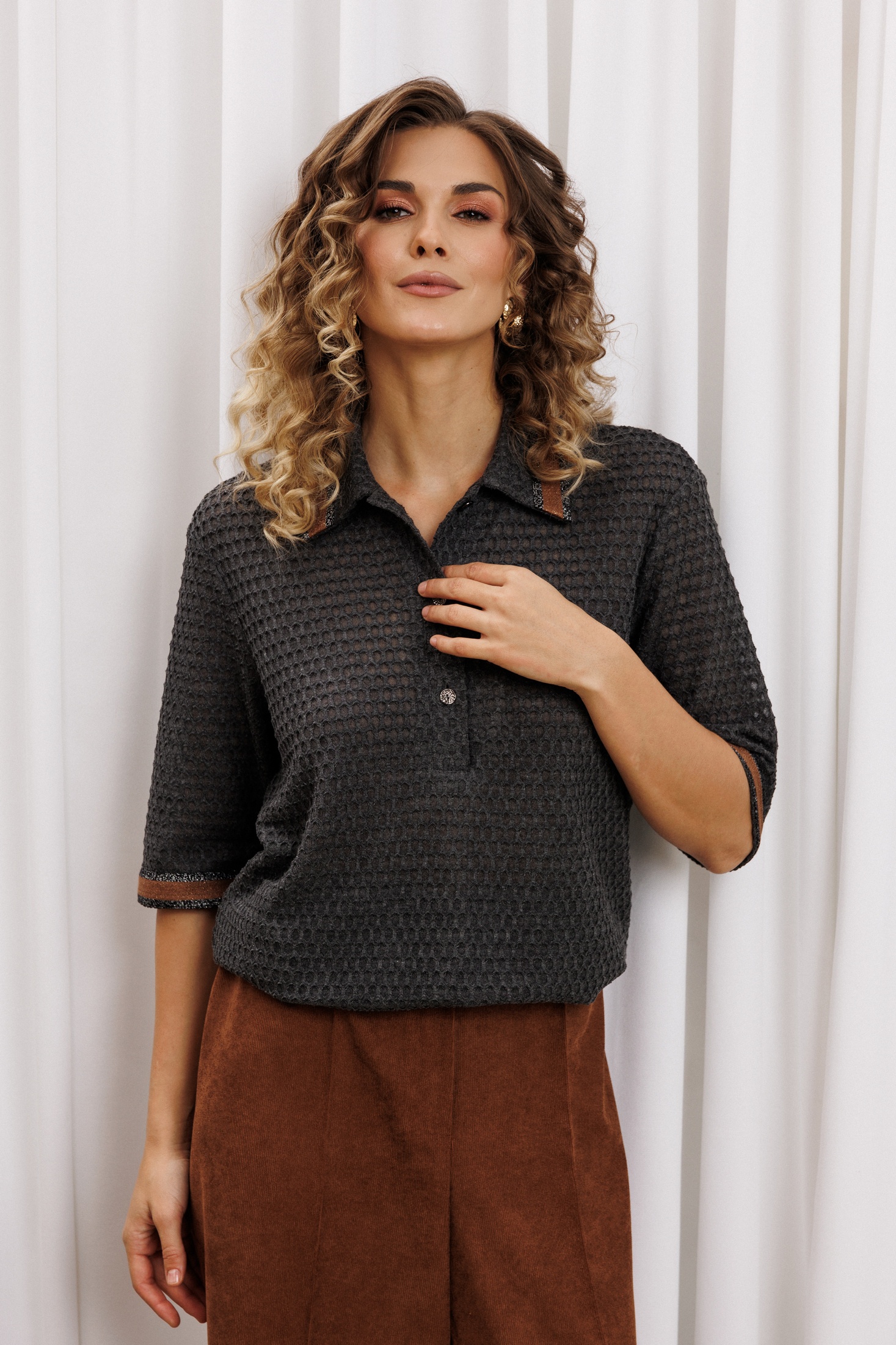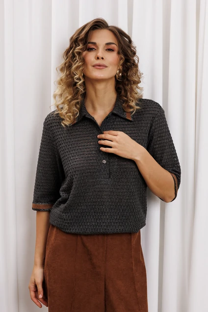 Элегантный джемпер средней длины выполнен из ажурного трикотажного полотна темно-серого цвета, который добавляет изысканности любому образу. Модель с прямым силуэтом оснащена застежкой поло и эффектными нагрудными вытачками на передней части, подчеркивающими линию бюста. Воротник и края коротких рукавов украшены декоративной тесьмой, создающей аккуратный контраст. Длина джемпера составляет 69 см, а длина рукава — 32 см, что делает его идеальным выбором для женщин ростом от 164 до 170 см. Эта модель станет отличным дополнением к гардеробу, подходящим как для повседневных, так и для более официальных ситуаций.
