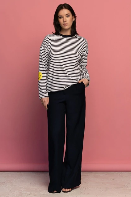 Джемпер( тельняшка) молодежный из трикотажного полотна со спущенной линией плеча, и рукавом длиной до запястья,перед и спинка с совмещением полосы по боковрму шву.