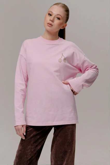 Джемпер молодежный из трикотажного полотна со спущенной линией плеча, и рукавом длиной до запястья,горловина округлой формы.По левой стороне полочки декор в виде вишенок выложеных стразами,по спинке принт. Длина 69 см. ширина по линии груди 54,56,58,60см. ( 42,44,46,48 рр) ширина по низу 54,56,58,60 см . Длина рукава от горловины 72см .