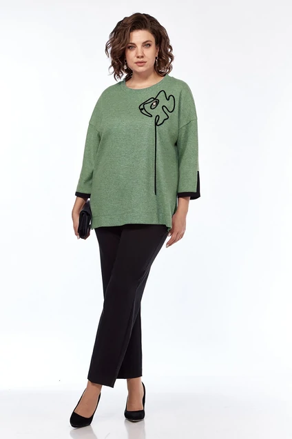 Джемпер женский свободного силуэта, выполнен из трикотажного полотна. Перед и спинка цельные горловина обработана планкой. Рукава спущенные по низу фигурные элементы из отделочной ткани. Джемпер декорирован дизайнерской вышивкой.