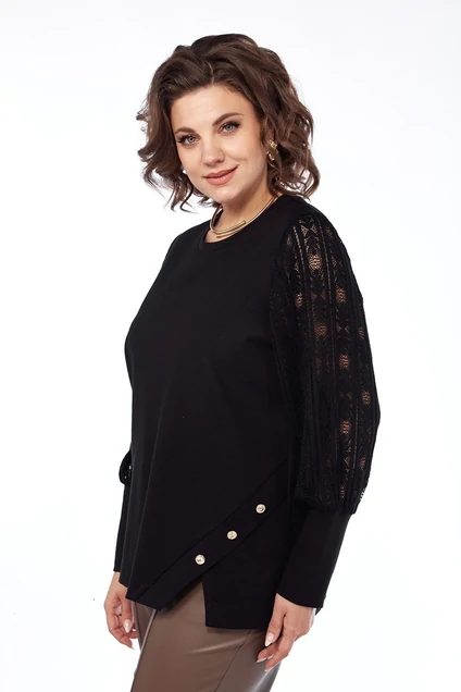 Джемпер женский нарядный, прямого силуэта, выполнен из трикотажного полотна. Горловина округлой формы. Низ переда с асимметричным элементом, декорированный пуговицами. Спинка цельнокроенная. Рукава втачные на манжете выполнены из ажурного трикотажного полотна.