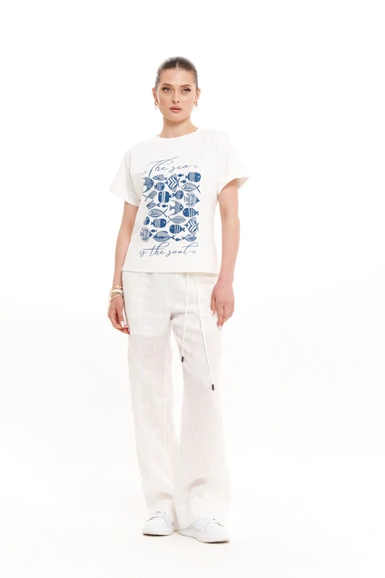 Джемпер женский из смесового трикотажного полотна с большим содержанием хлопка. Джемпер для повседневной носки прямого силуэта. Перед имеет дизайнерскую печать в виде очаровательных рыбок. В боковом шве имеются небольшие разрезы. Горловина чуть расширенная, обработана притачной тесьмой. Рукава цельнокроеные, длиной чуть ниже локтя. Легкий и очень практичный джемпер белого оттенка для вашего время провождения. В нем вы будете чувствовать легкость и комфорт в каждом движении. Данный джемпер будет отлично смотреться на любой фигуре.