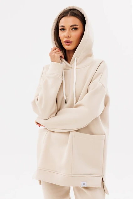 Худи Oversize модели 4057 с капюшоном на подкладке из основной ткани, с боковыми накладными карманами, с боковыми разрезами по низу изделия, удлиненная спинка. Ткань футер (3-х ниточный) с внутренним слоем утепленным начесом, качество Пенье, плотность 395 г.м2