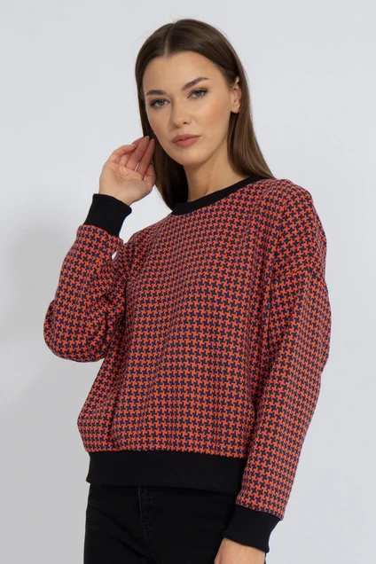 Джемпер трикотажный с рисунком, укороченный, со спущенным рукавом.