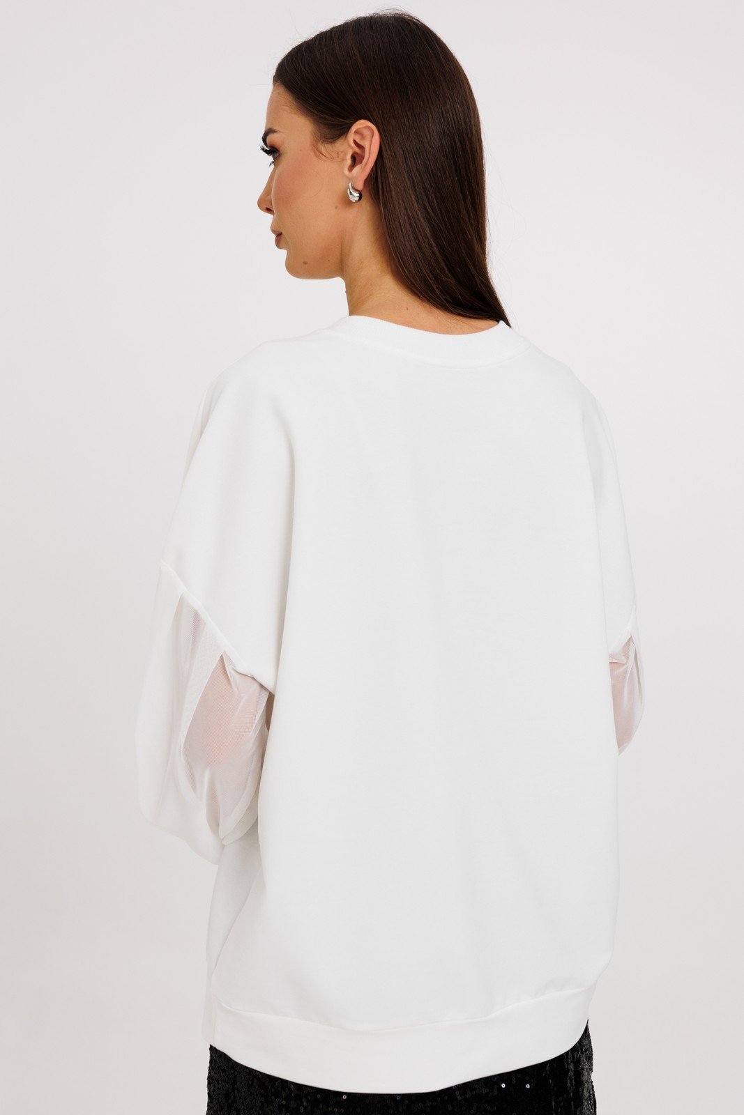 Этот джемпер свободного силуэта, изготовленный из высококачественного двухниточного футера с нежным изнаночным слоем, сочетает в себе комфорт и элегантность. Рукава из сеточной ткани со складками по пройме добавляют ему легкость и воздушность, создавая утонченный и современный образ. Идеален для прохладных дней и уютных вечеров, этот джемпер не только подчеркнет вашу индивидуальность, но и подарит ощущение тепла и уюта, окружая вас мягкостью и заботой.