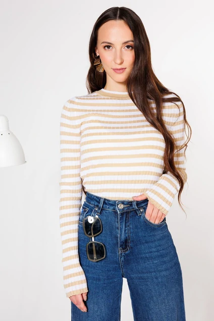 Универсальный джемпер из тонкой хлопковой пряжи. Он идеально прилегает к телу, позволяя носить его в прохладные дни как базовый слой с жакетами, кардиганами или пальто. Такая пряжа мягко греет и совсем не колется, а благодаря обработке волокон специальным составом джемпер долго не потеряет форму и не сядет при стирке. Благодаря полосатой расцветке - любой образ станет интереснее. Длина - 58 см.