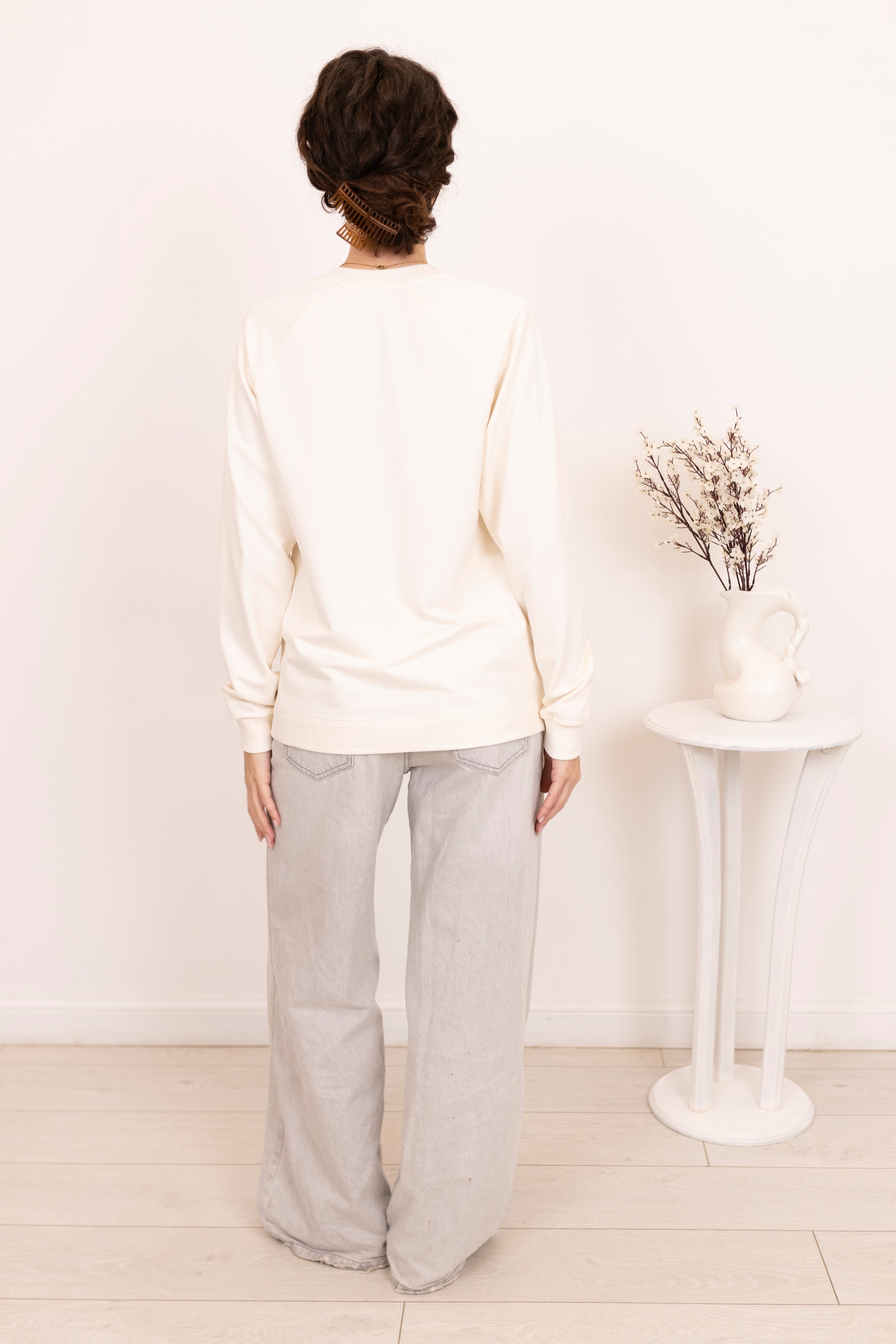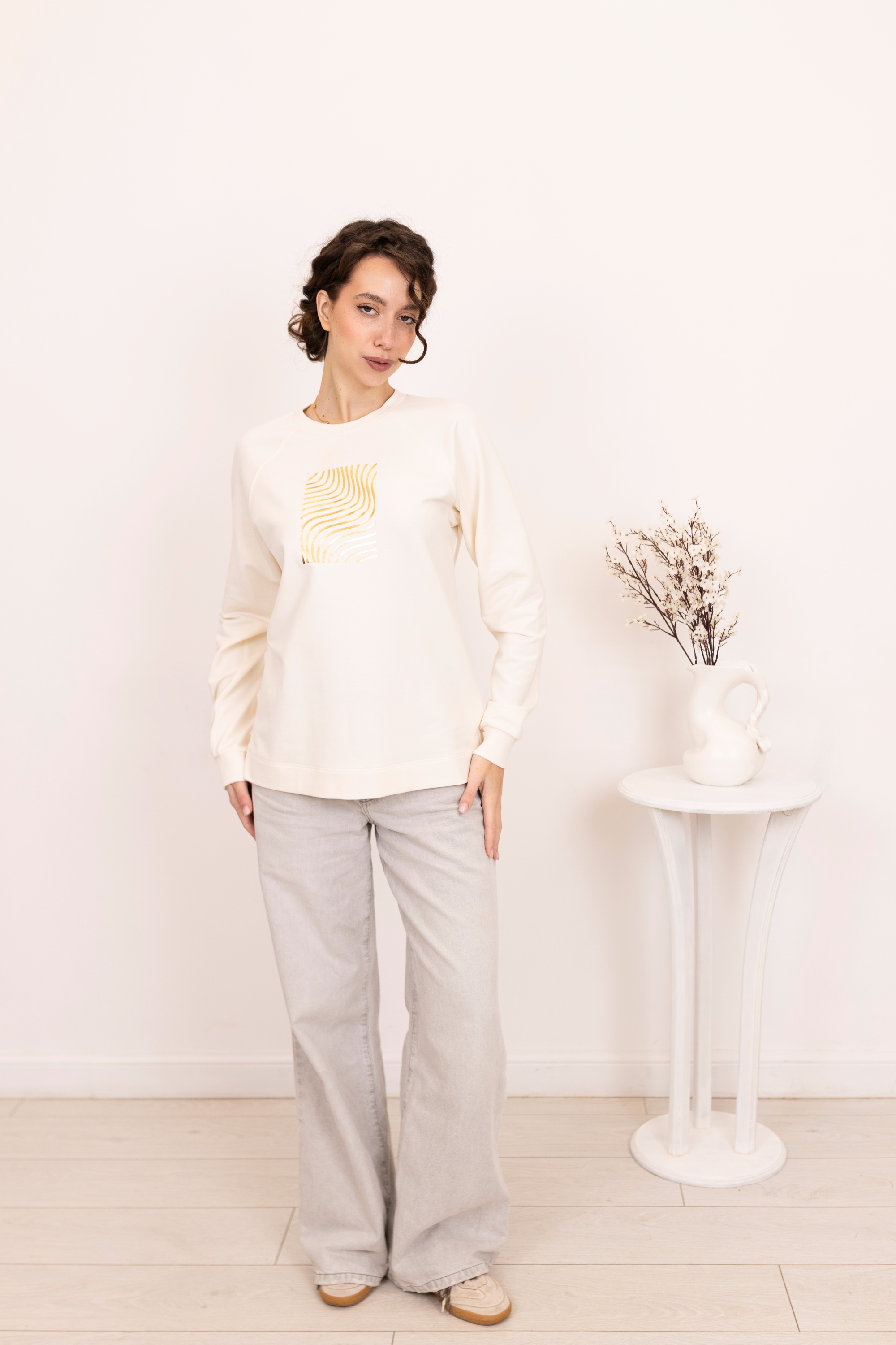 Джемпер женский в стиле casual, идеальное сочетание уюта и стиля. Изготовлен из мягкого материала в молочном оттенке, этот джемпер служит основой для множества образов. Особое внимание привлекает графический принт на передней части в виде золотистого спирального узора, который добавляет изысканности и современного шарма. Дизайн с длинными рукавами и классическим круглым вырезом делает его универсальным выбором для повседневной носки. Дополнительный комфорт обеспечен благодаря свободному крою, который не ограничивает движения. Этот джемпер легко сочетается как с более формальными брюками, так и с джинсами, открывая широкие возможности для создания как строгих, так и более расслабленных ансамблей.