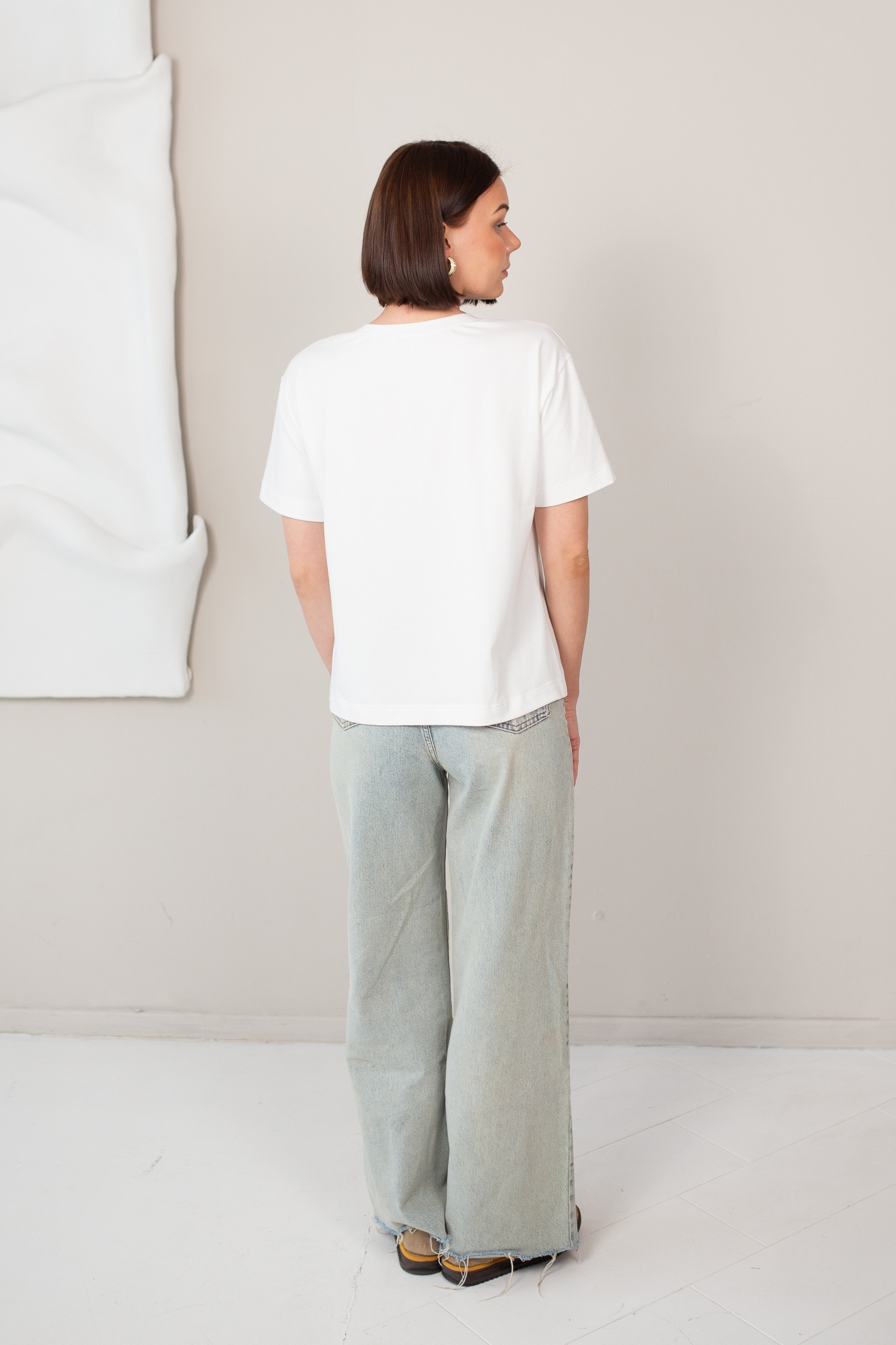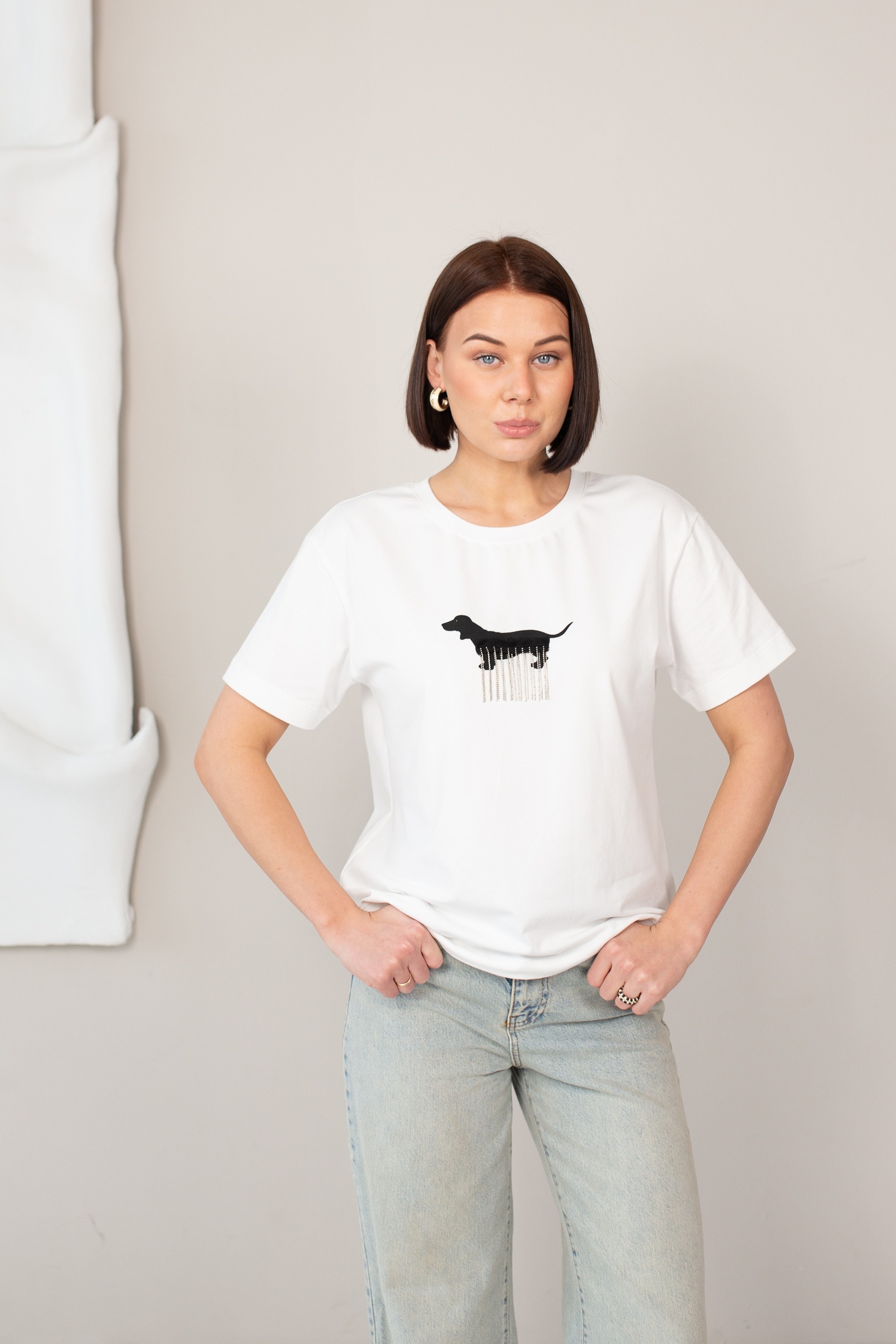 Белый джемпер свободного кроя выполнен из мягкого хлопка, что обеспечивает комфорт на каждый день. Модель украшена минималистичным черным принтом в виде силуэта собаки на передней части, акцентирующим внимание на оригинальном стиле изделия. Классический круглый вырез гармонично сочетается с короткими рукавами и прямым силуэтом, создая универсальный базовый вариант для повседневного гардероба.