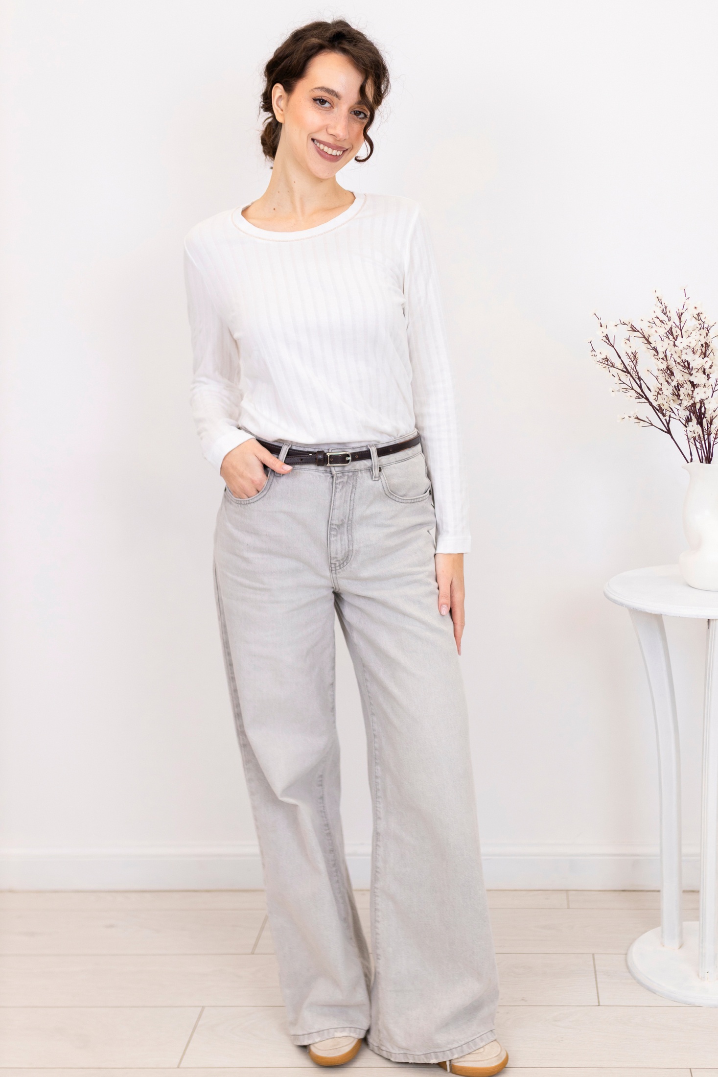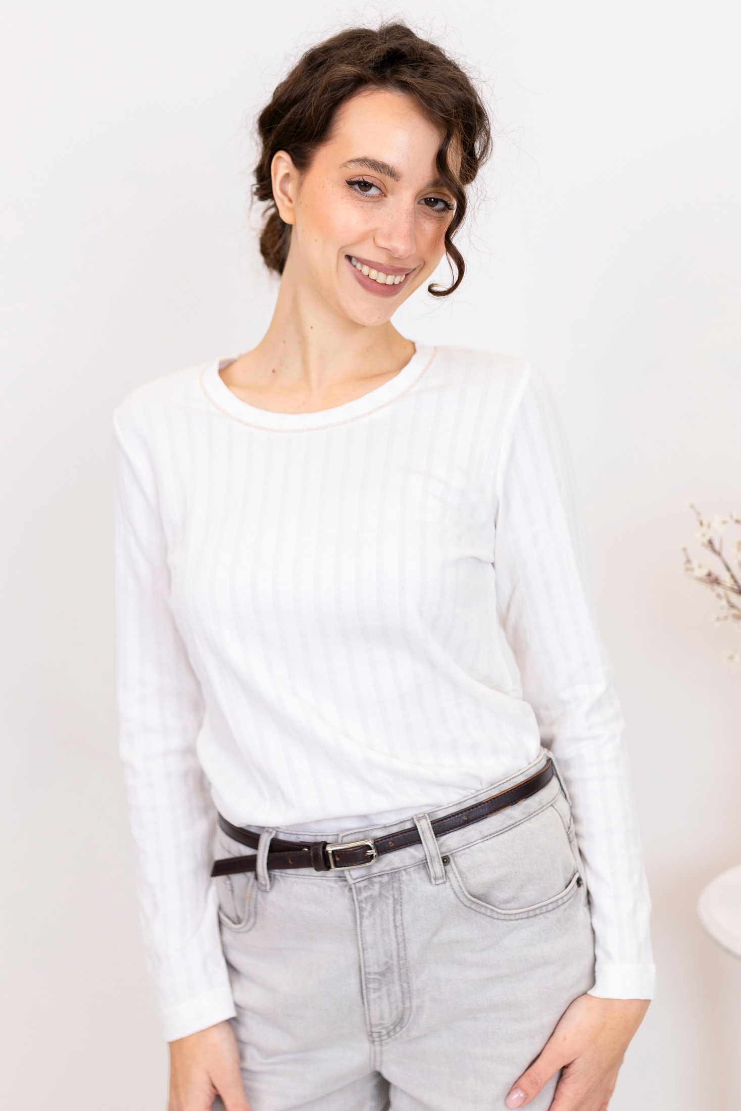 Элегантный белый джемпер на каждый день. Оснащен тонкими вертикальными ребристыми полосами, придающими аккуратный текстурный внешний вид. Джемпер выполнен с длинными рукавами и круглым вырезом, обеспечивая классический и универсальный вид. Идеальное дополнение к базовому гардеробу, подходит как для офиса, так и для повседневной носки.