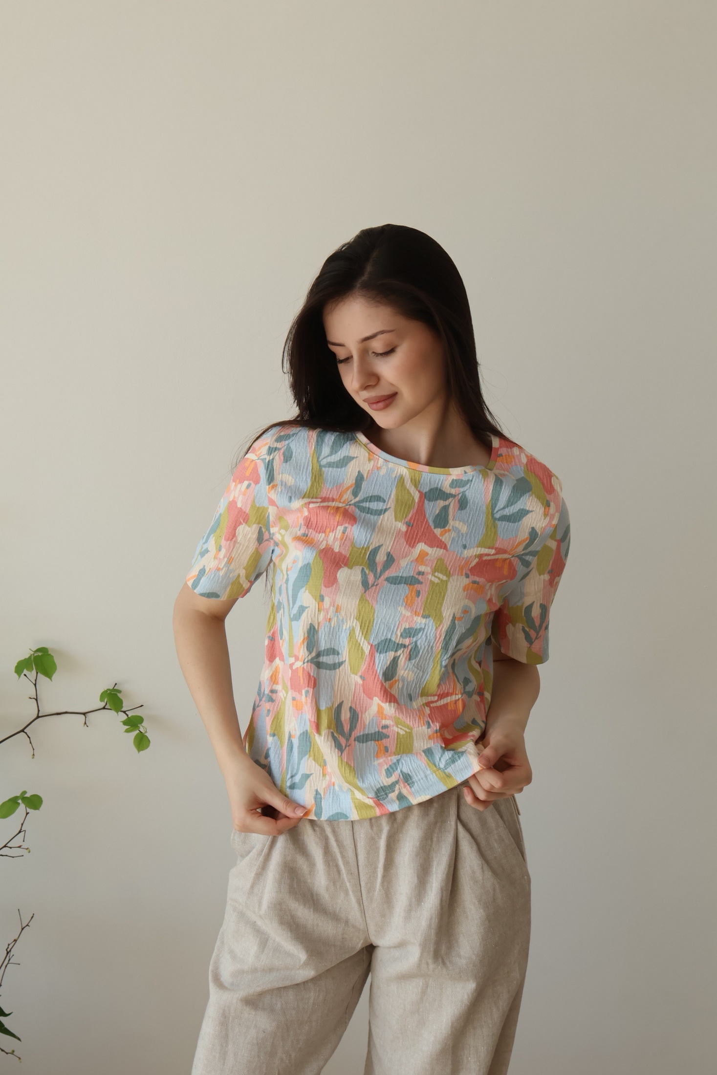Джемпер 687100 от бренда КУПАЛИНКА сочетает в себе яркие краски и комфорт. Коллекция бренда предлагает джемпер из хлопка с добавлением полиэстера и полиуретана, обеспечивающих практичность и мягкость. Свободный крой и короткие рукава делают его идеальным вариантом для весенних и летних прогулок. Абстрактный разноцветный рисунок придаёт свежести и оригинальности. Джемпер прекрасно сочетается с джинсами или легкими брюками, подходя как для повседневного, так и для молодежного стиля. Небольшие разрезы по бокам добавляют дополнительную свободу движений. Этот джемпер станет ярким акцентом в вашем гардеробе и подарит комфорт в любое время года.