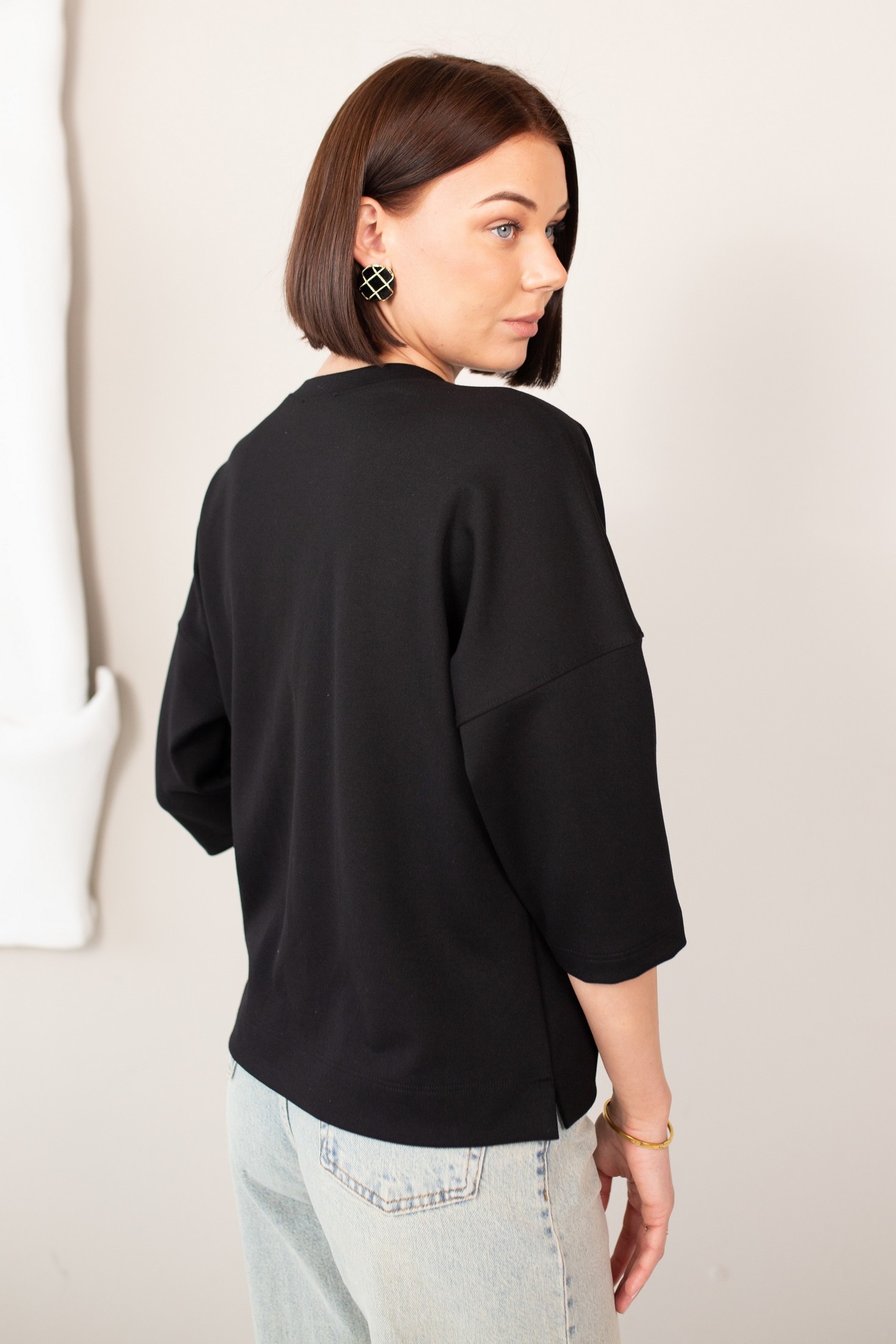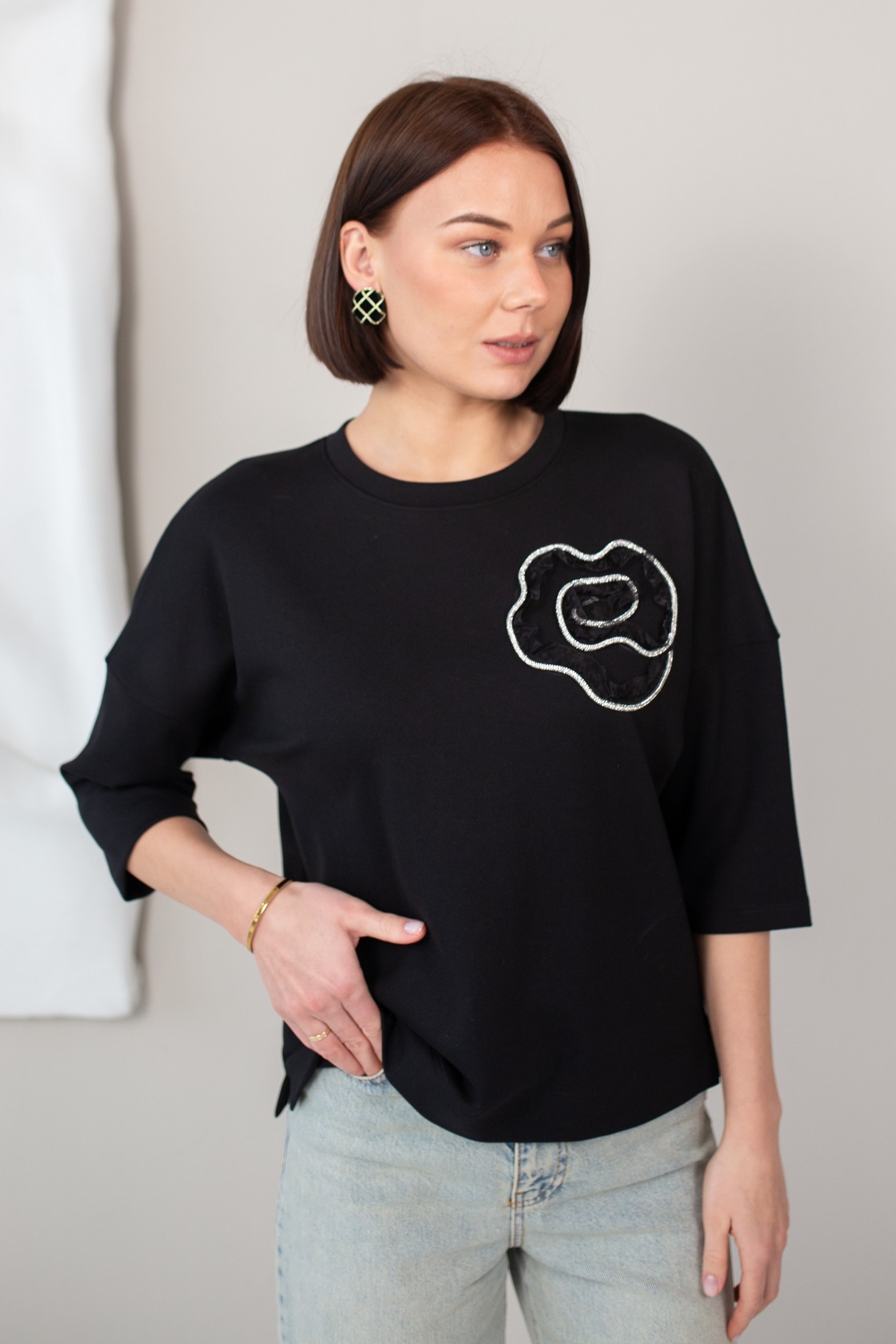 Джемпер 693205 КУПАЛИНКА – это стильный выбор для любого гардероба. Коллекция бренда КУПАЛИНКА предлагает этот джемпер из вискозы, который обладает мягкостью и эластичностью, благодаря добавлению полиэстера и полиуретана. Джемпер имеет длинный рукав с 3/4 длиной и украшен аппликацией, что добавляет ему уникальности. Чёрный цвет и лаконичный рисунок делают его универсальным для повседневного ношения в демисезонный период. Этот фасон прекрасно подходит для офисного стиля, подчеркивая минимализм и элегантность образа.