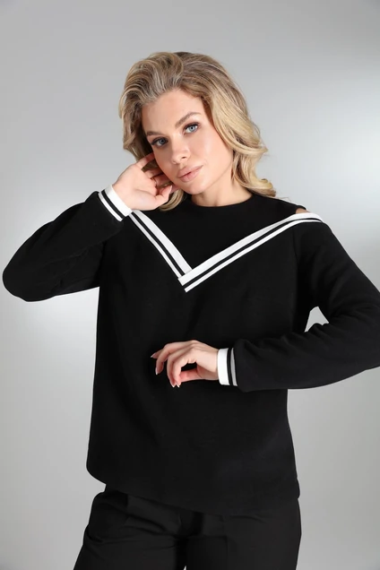 Джемпер свободного объёма, оригинального кроя, с имитацией топа и открытыми плечами. Горловина круглая, по спинке застежка на петлю и пуговицу Отделка горловины джемпера и манжеты выполнены из довязов в контрастном цвете.