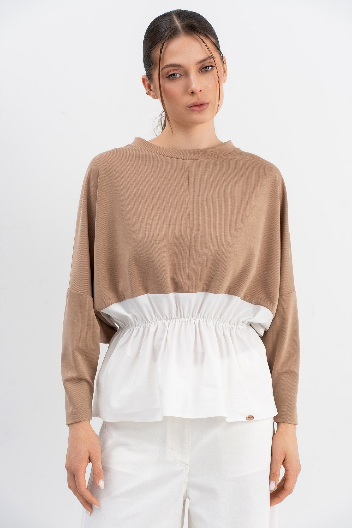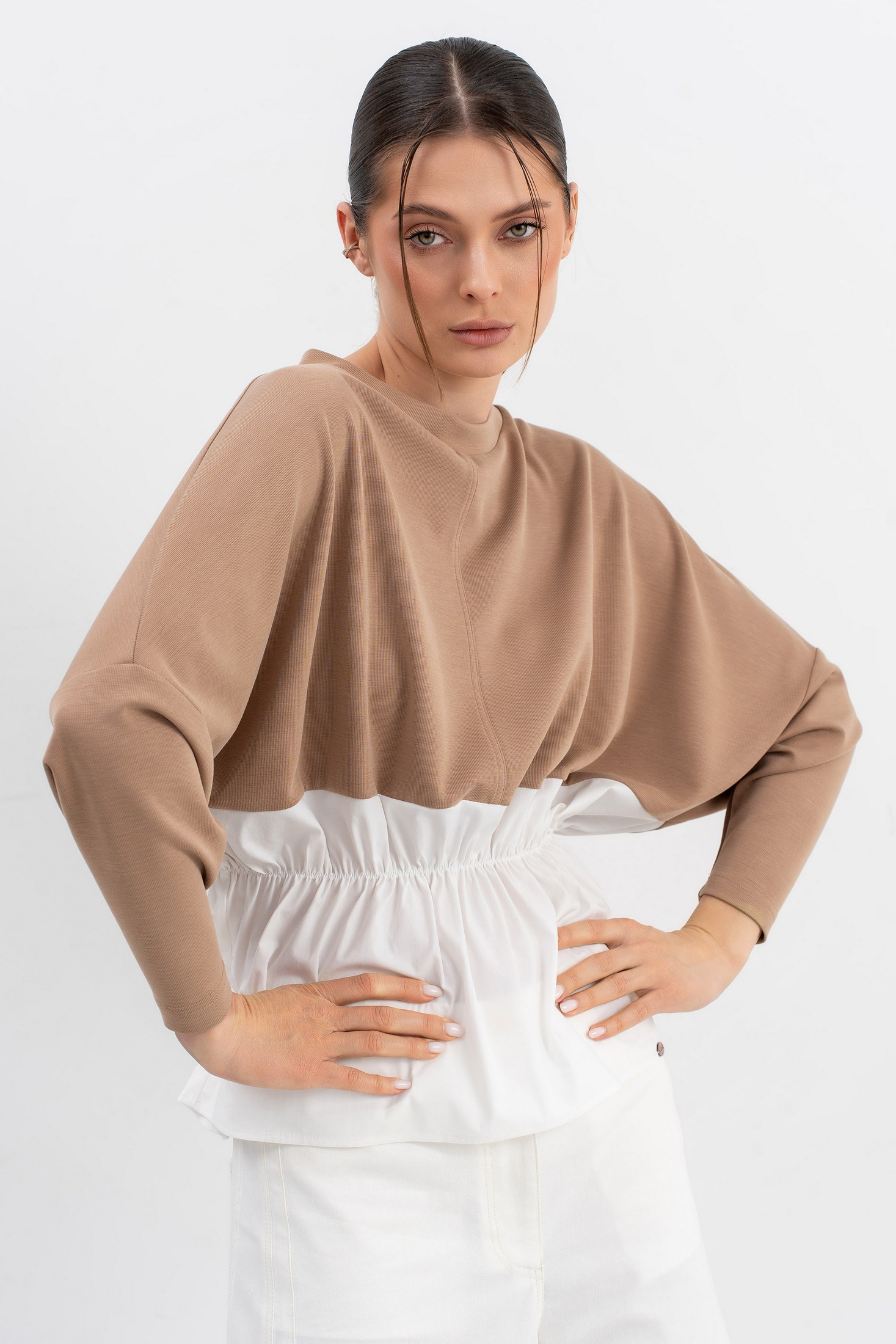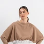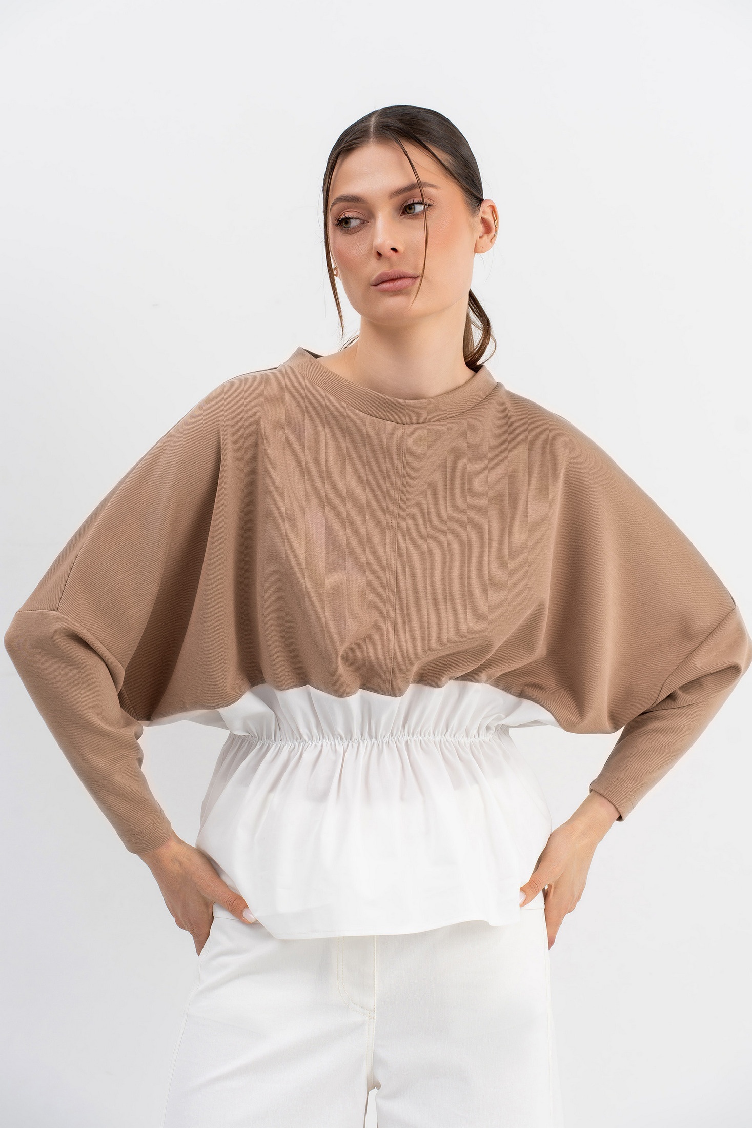 Джемпер необычного кроя трапецивидного силуэта со спущенной линией плеча и небольшим рукавом,низ выполнен из ткани-компаньона (хлопок),по талии резинка.