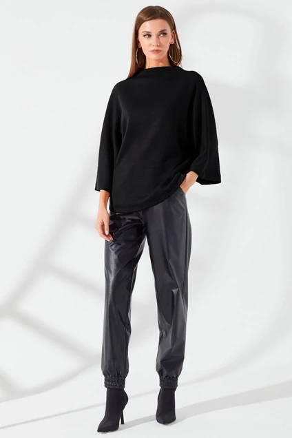 Стильный джемпер свободного силуэта из трикотажа с фигурным низом. Горловина-стойка цельнокроеная. Рукав покроя ‘”летучая мышь длиной 3/4. По низу изделия на спинке молния. Длина джемпера : (69см-44-48рр)( 71.5см-50-54рр)( 74см-56-60рр)
