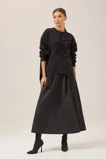 Джемпер прямого силуэта из трикотажного полотна. Горловина округлая. Рукав со спущенной линией плеча по низу на манжете. Низ изделия фигурный с декоративной фурнитурой . По переду дизайнерская вышивка. Длина джемпера ( 44-48р- 59см)(50-54р - 62см)
