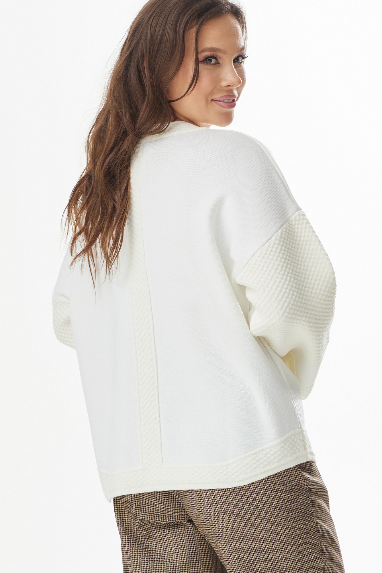 Модель идет в едином размере. Вязаный джемпер свободного кроя. Рукав спущен. Джемпер выполнен из качественной пряжи премиум класса разных фактур. Не скатывается. Приятный к телу. Дополнен качественной декоративной печатью. Длина от плечевого шва 62 см. Длина рукава 60см.