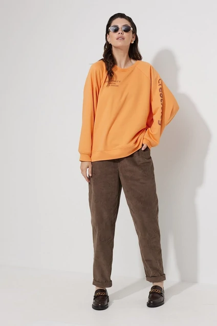Свитшот свободного силуэта, линия плеча спущена. Выполнен из трикотажного полотна футер 3-х нитка в оранжевом цвете. Вырез горловины овальной формы, рукава втачные одношовные. На свитшот нанесены дизайнерские печати. Отлично сочетается с брюками и юбками.