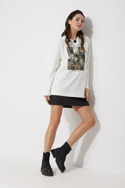 Лонгслив свободного силуэта со спущенной линией плеча. Выполнен из трикотажного полотна футер 3-х нитка.Вырез горловины овальной формы, обратотан притачной бейкой. На перед изделия нанесена дизайнерская печать, которая отлично дополняет лонгслив и делает его уникальным. Модель в 2 размерах 42-46 и 48-52.