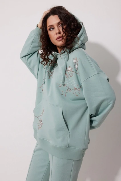 Модель one size (42-52). Худи свободного силуэта oversize с спущенной линией плеча. Изготовленное из трикотажного полотна футер 3-х нитка петля/диагональ. Овальный вырез горловины добавляет нотку расслабленности, а капюшон с люверсами и шнуром с миниатюрной печатью придает изделию современный вид. Накладной карман "кенгуру" не только выглядит стильно, но и обеспечивает удобство для хранения мелочей и согревания рук. Дизайнерские печати, нанесенные по всему изделию, делают худи уникальным и выделяющимся, отражая индивидуальный стиль. Втачные одношовные рукава обеспечивают хорошую посадку и добавляют дополнительный комфорт в движениях. Низ изделия и рукава обработаны манжетами из отделочной ткани кашкорсе, что придает изделию завершенный вид.